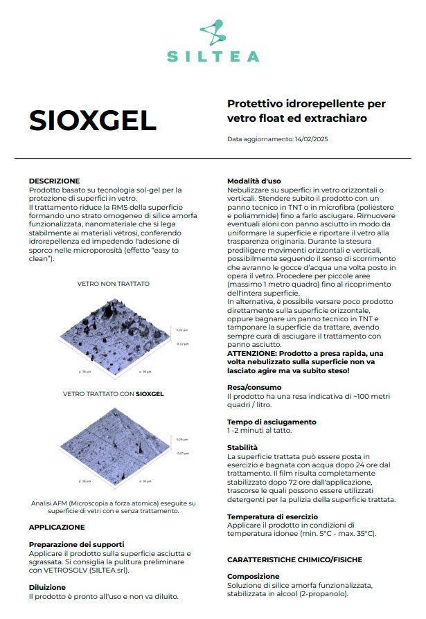 SIOXGEL è un trattamento protettivo innovativo basato su tecnologia sol-gel, specificamente sviluppato per proteggere superfici in vetro conferendo idrorepellenza superiore e impedendo l'adesione di sporco, calcare e impurità nelle microporosità. Ideale per applicazioni residenziali, commerciali e industriali, questo prodotto rappresenta la soluzione definitiva per mantenere le superfici vetrate pulite, brillanti e protette nel tempo.