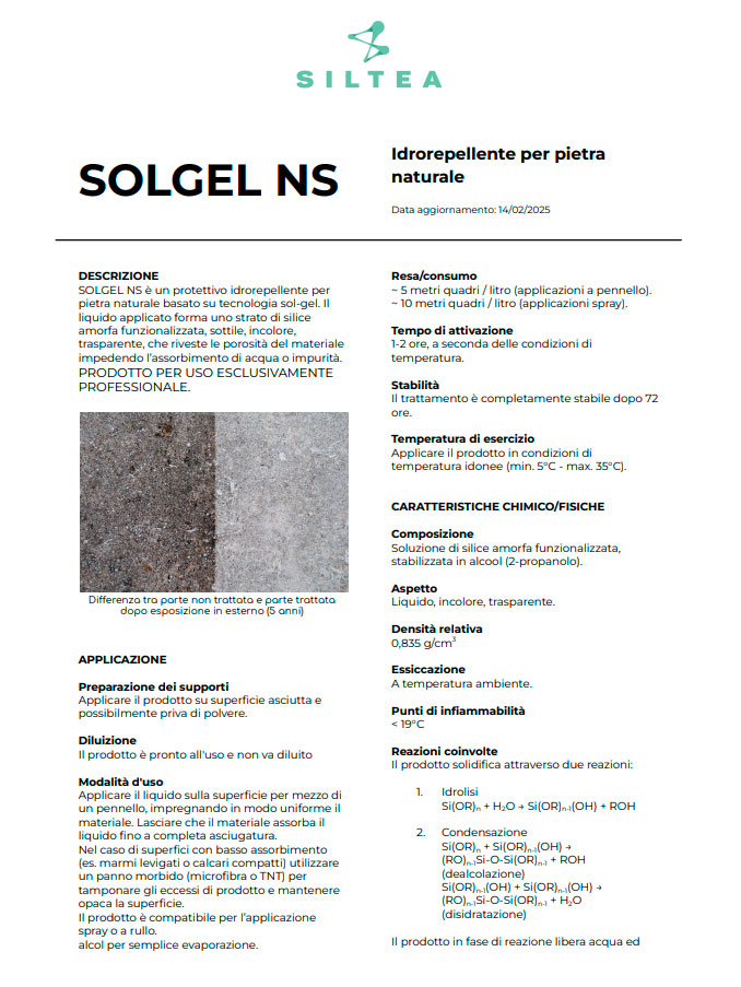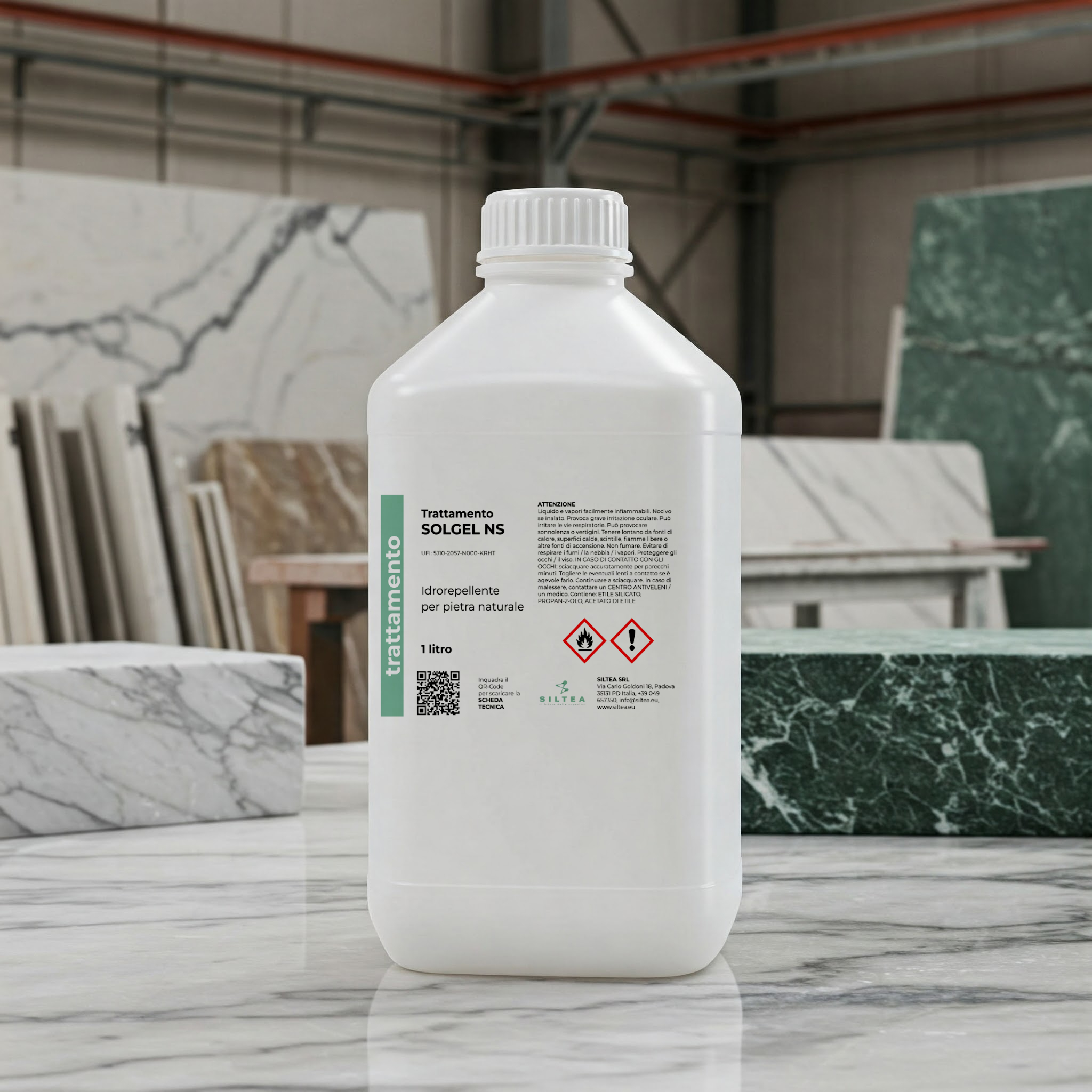 SOLGEL NS è un trattamento protettivo idrorepellente professionale basato su tecnologia sol-gel, specificamente sviluppato per applicazioni su pietra naturale e materiali porosi esposti agli agenti atmosferici. Ideale per marmi, graniti e superfici lapidee in ambienti esterni, questo prodotto garantisce protezione efficace dall'acqua e dagli inquinanti preservando la naturale traspirazione del materiale.