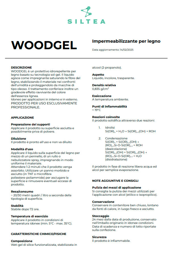 WOODGEL è un trattamento protettivo idrorepellente innovativo per legno, basato su tecnologia sol-gel, che isola efficacemente il materiale da acqua e umidità preservando la naturale traspirazione delle fibre lignee.
