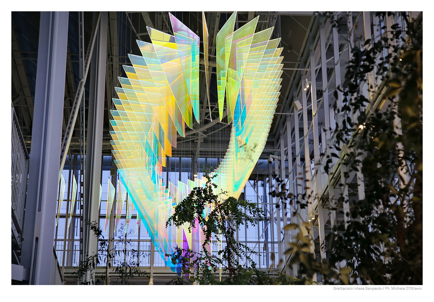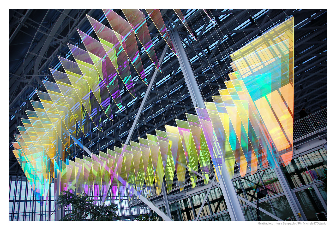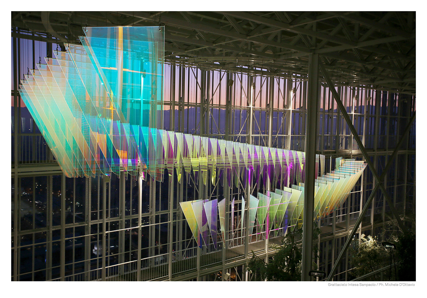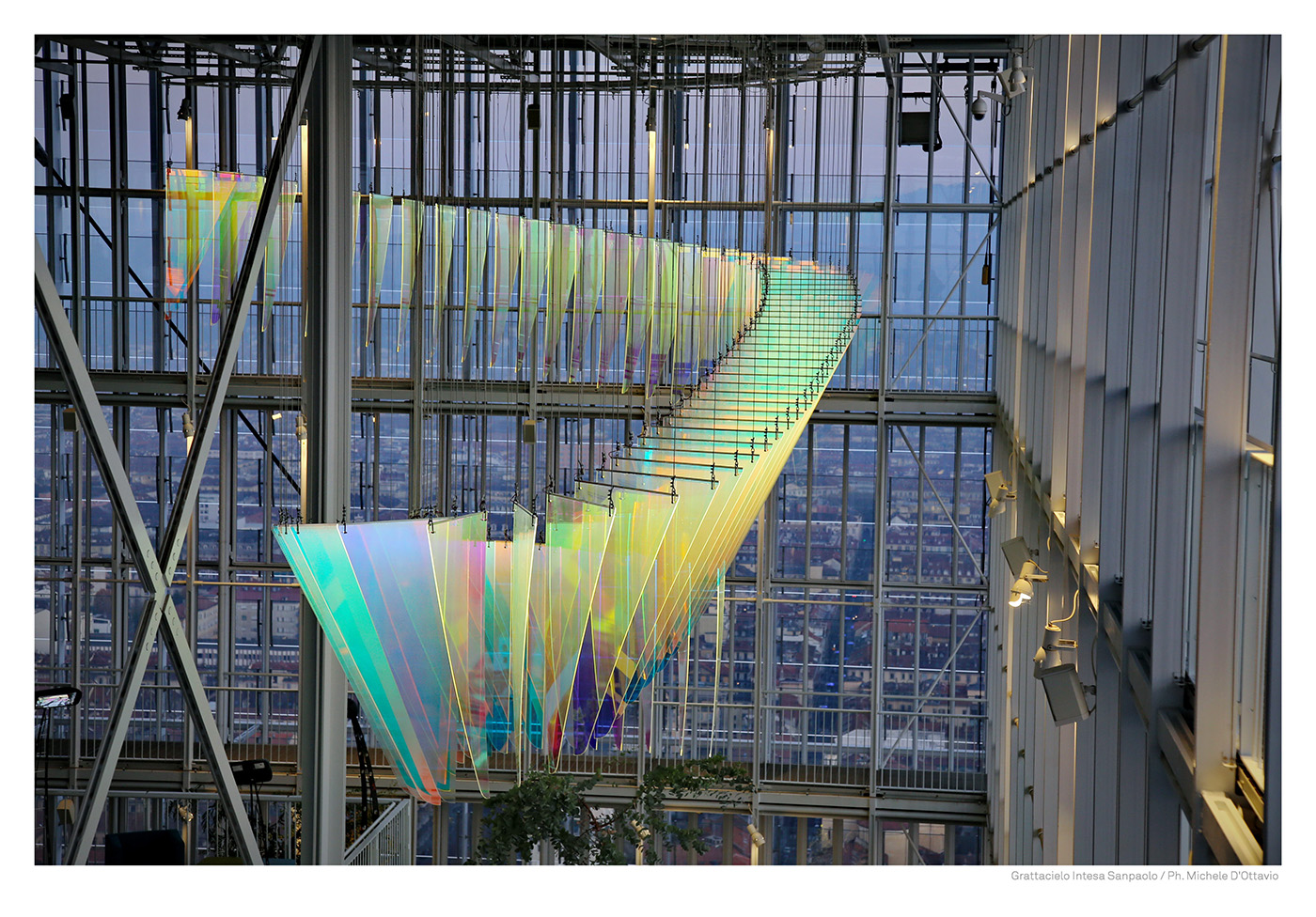E’ nel cuore del grattacielo, all’interno della serra bioclimatica, che un’onda di colore, sensibile ai mutamenti della luce, invade lo spazio fino a 16 metri di altezza. 100 scaglie luminose, come frame in stop motion, generano, grazie ad una tecnologia innovativa, un vortice iridescente reso vivo e cangiante dalla luminosità che l’oggetto stesso irradia e in dialogo con la riflessione costante della luce naturale