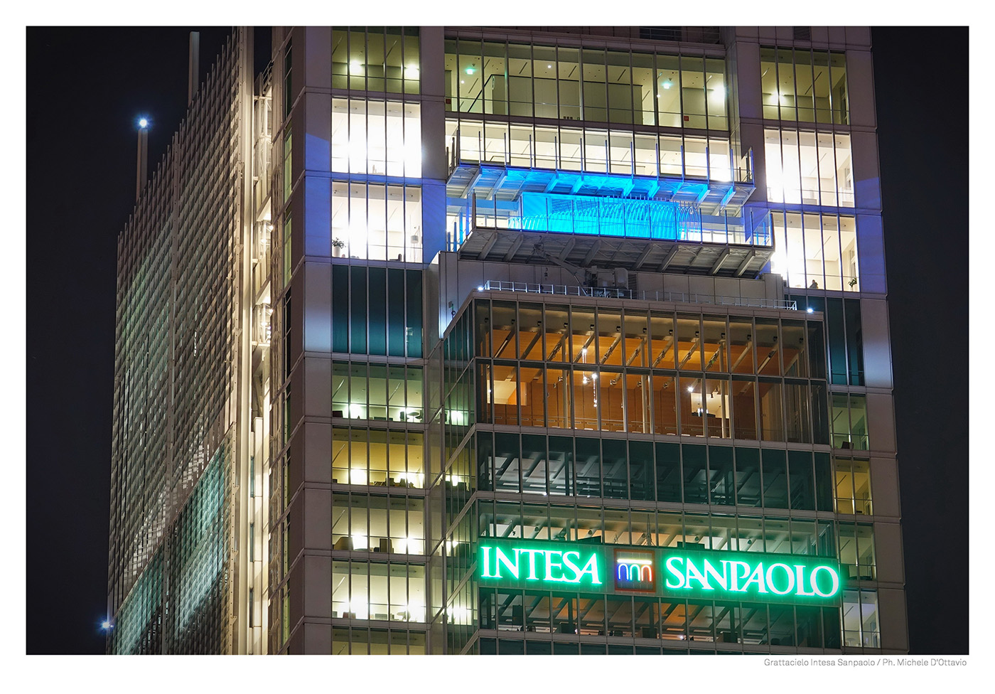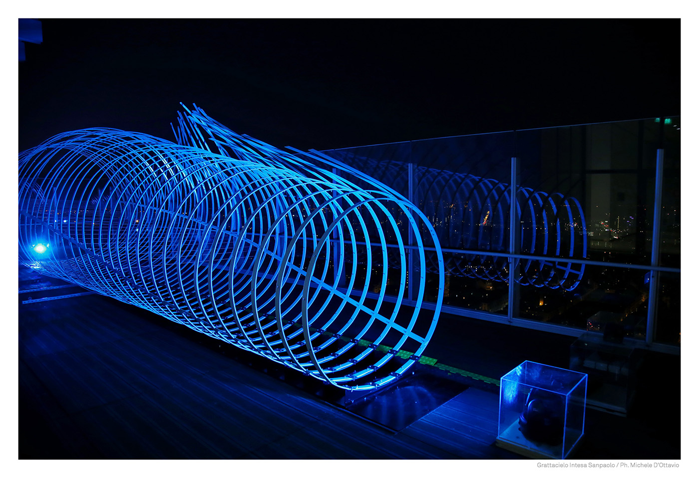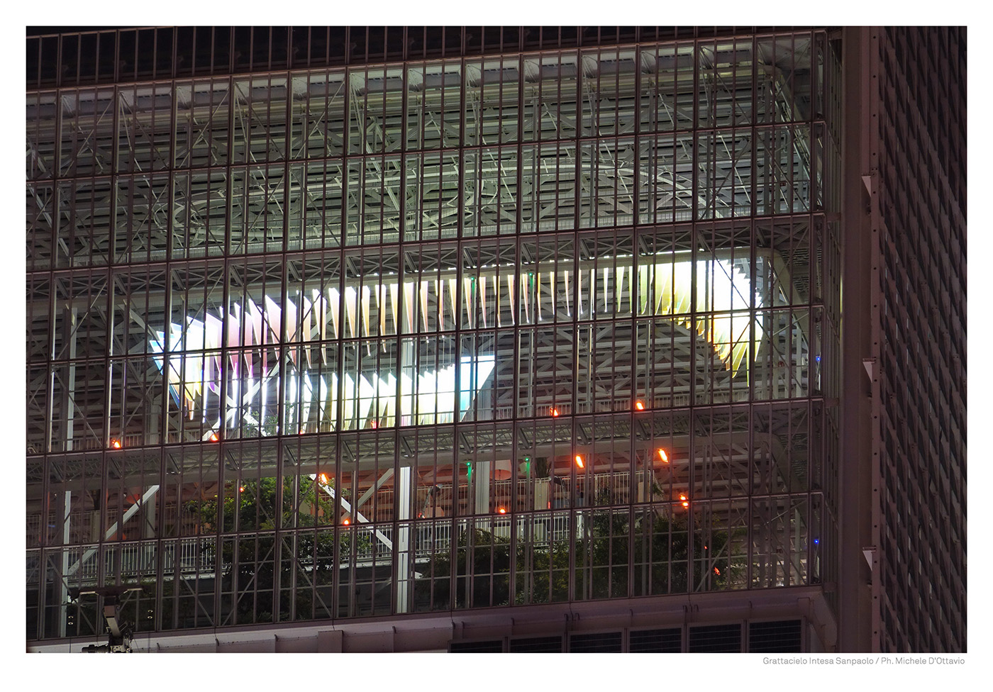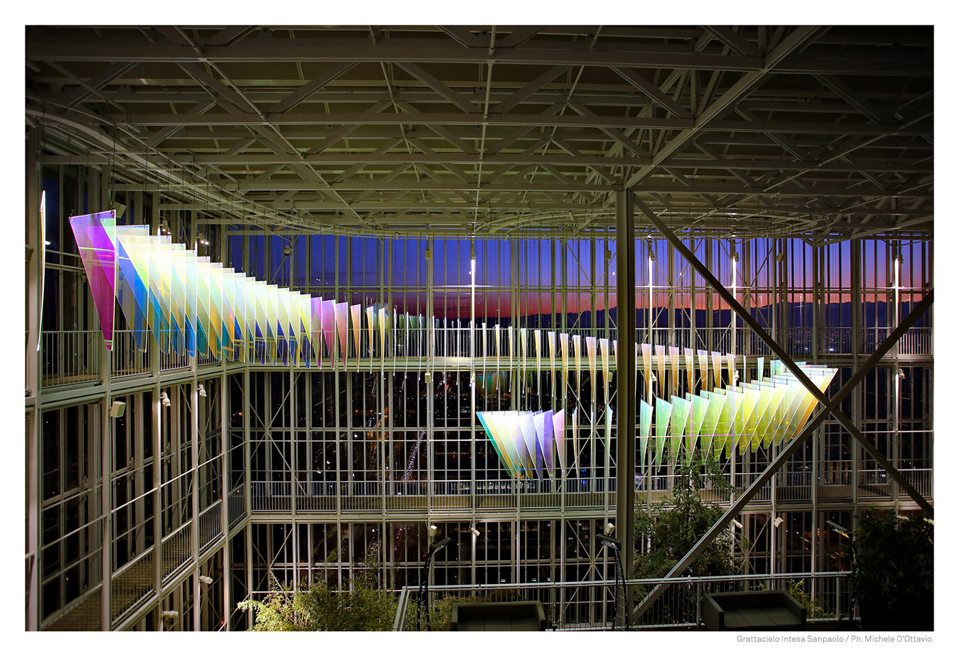 E’ nel cuore del grattacielo, all’interno della serra bioclimatica, che un’onda di colore, sensibile ai mutamenti della luce, invade lo spazio fino a 16 metri di altezza. 100 scaglie luminose, come frame in stop motion, generano, grazie ad una tecnologia innovativa, un vortice iridescente reso vivo e cangiante dalla luminosità che l’oggetto stesso irradia e in dialogo con la riflessione costante della luce naturale