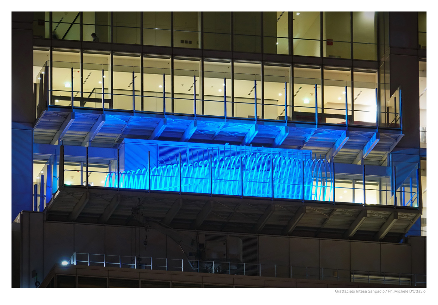 Un’onda di luce dinamica che si espande in facciata dove, a 145 metri di altezza, 1 km di nastri flessi in vetroresina ondeggia nel vento, restituendo una ripetizione infinita del segno alfa che assume, grazie alla luce, un potente valore narrativo