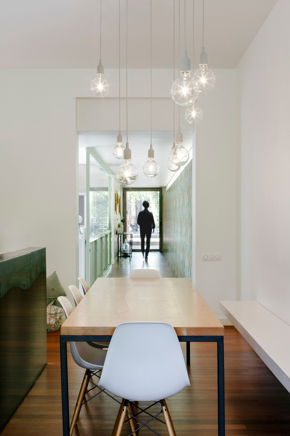Girovagare per la casa è diventato davvero piacevole: una carta da parati verde nella lunga sala d'ingresso riflette la natura esterna sul suo schema grafico. Linda, Philippe ed i loro tre figli possono ora godere appieno del giardino: l'ispirazione principale e la parte centrale del design