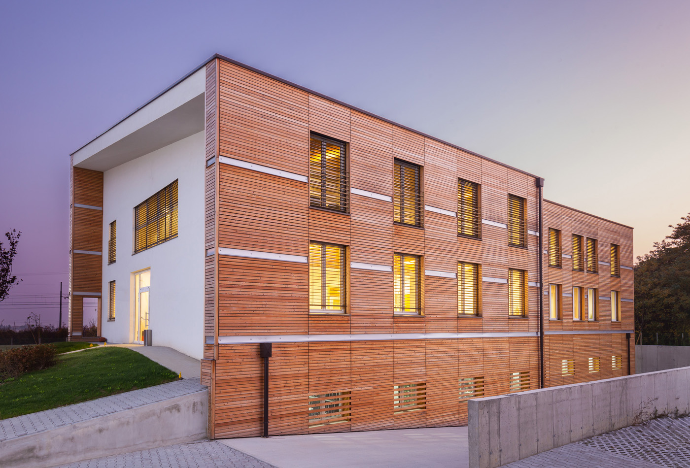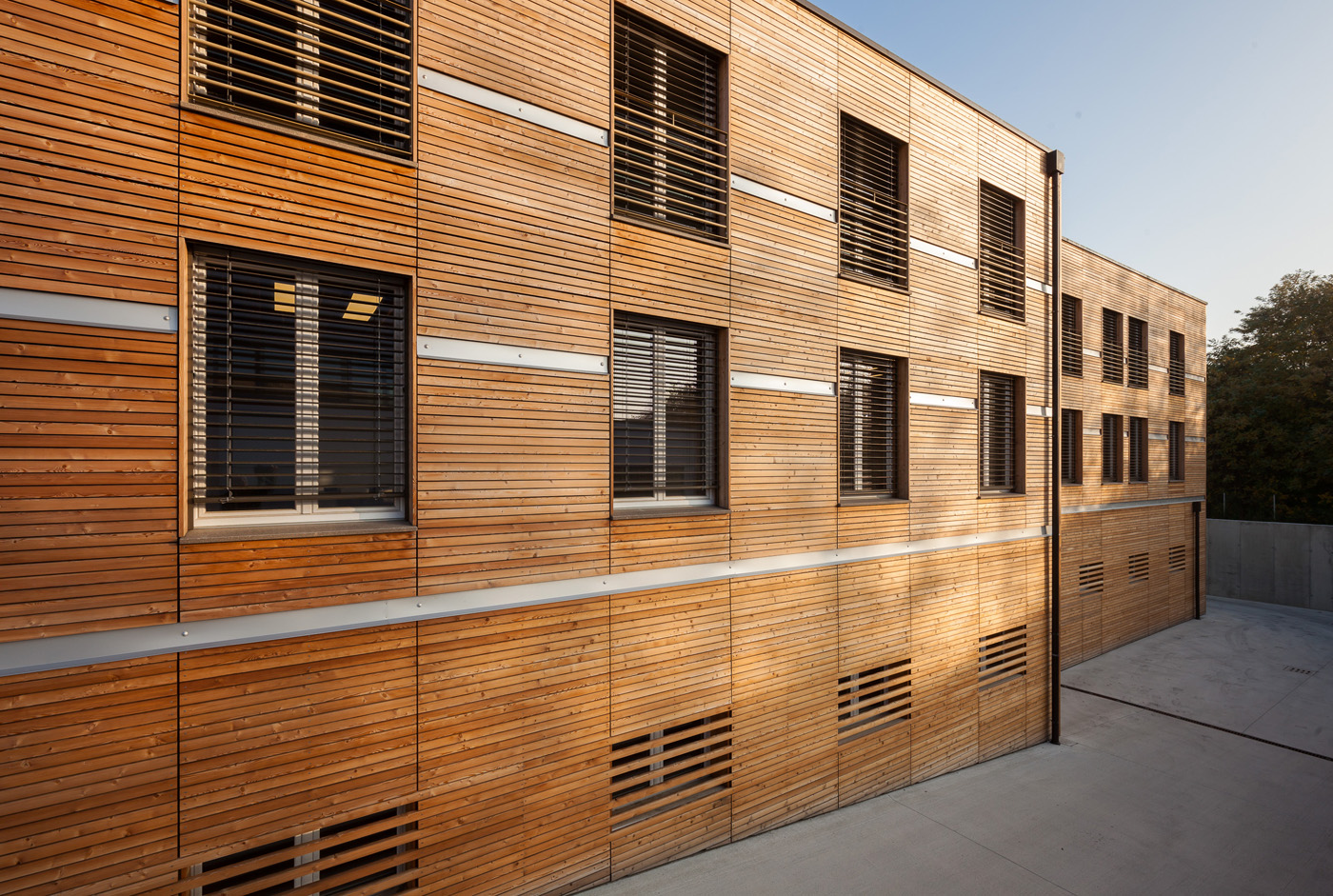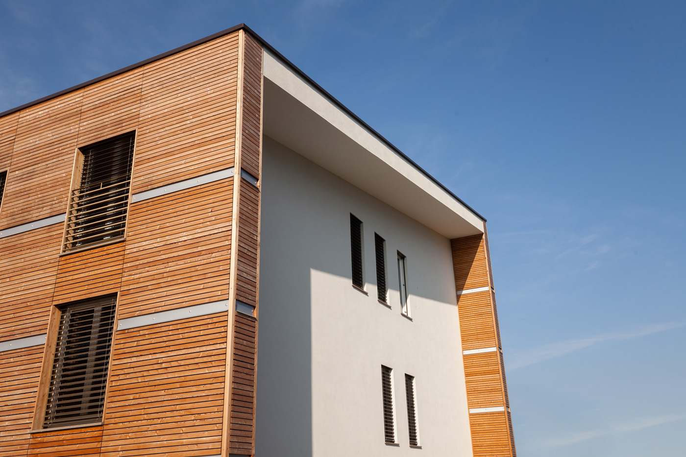 L’edificio presenta un linguaggio architettonico interessante grazie al ritmo proposto sulle facciate esterne, sempre in legno, ma sfruttate nel contesto per l’utilizzo di parete ventilate generando un ulteriore abbattimento termico