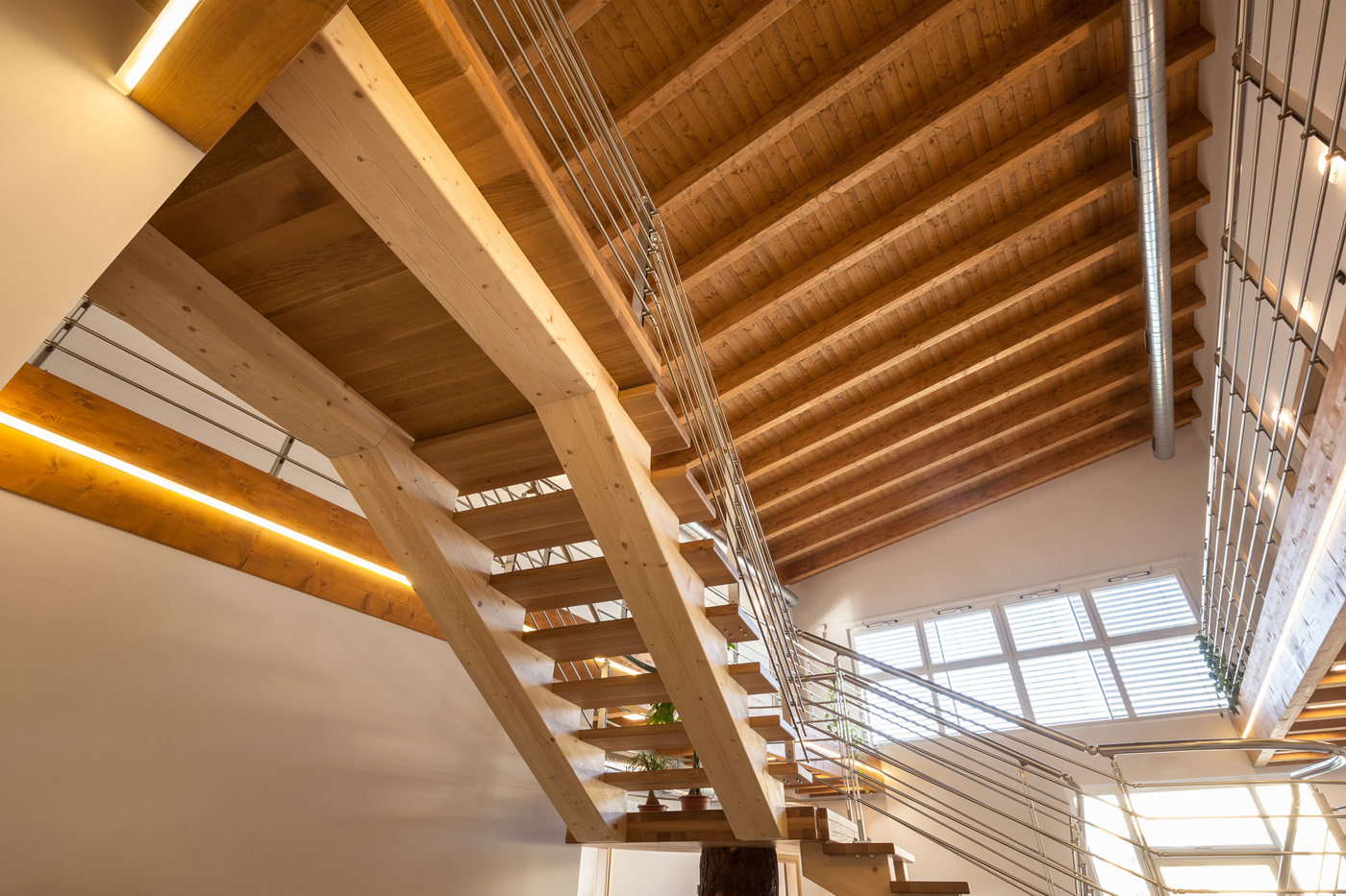 La superficie utile di progetto è pari a 1.239 m2 ed è suddiviso in un piano semi-interrato in cemento armato che funge da stoccaggio, attrezzeria, archiviazione documentale, ricevimento merci, centrale termica e zona monta carico. Al primo piano si trovano l’ingresso principale, la reception, gli uffici tecnici, commerciali ed amministrativi, nonché il Datacenter. Al secondo piano sono collocati gli uffici, le sale riunioni, la biblioteca, una palestra e sale corsi. La parte interrata è separata dalla parte superiore, realizzata completamente in legno, con un sistema di coibentazione con pannelli di tipo in poliuretano espanso rigido che permette di correggere eventuali ponti termici su due corpi differenti in materiali differenti