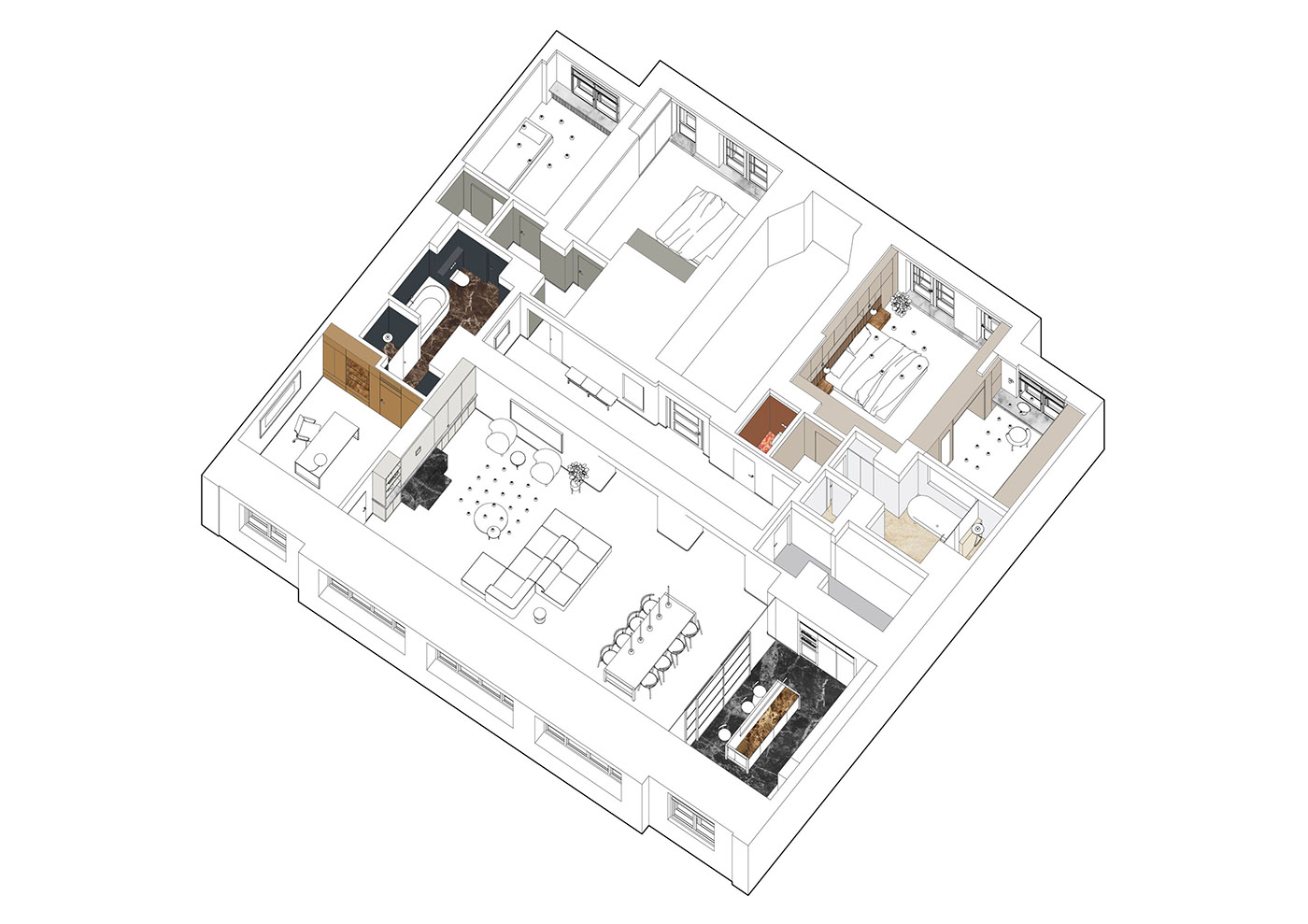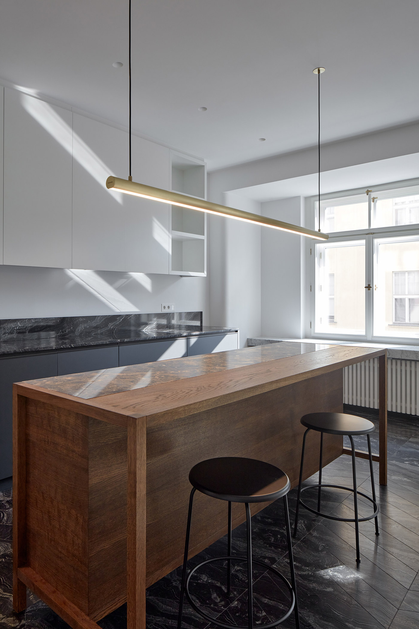 Il progetto gioca con la varietà di materiali e colori e le loro interazioni, talvolta audaci, che migliorano la diversificazione dell'esperienza spaziale. Il pavimento in rovere massello tinto attraversa tutte le zone giorno come una texture morbida e unificante. Il suo modello di posa francese continua nel pavimento in pietra in cucina con piastrelle in pietra tagliate su misura. L'appartamento presenta complessivamente sei diversi tipi di pietre (quattro tipi di marmo, granito nero e travertino rosso) e per alcuni dettagli anche una preziosa radica e l’ottone