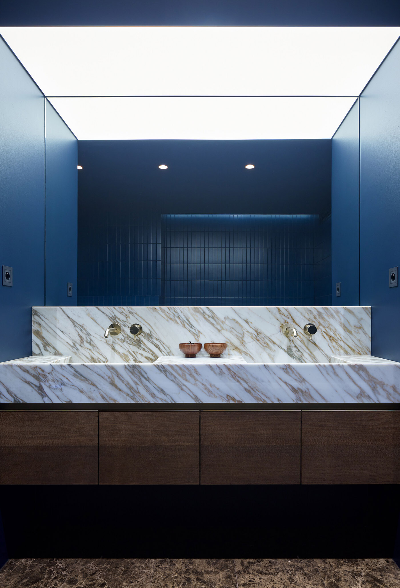 La zona "privata" con le camere da letto dà sulla facciata posteriore e ha un carattere più intimo. La terza zona "soglia" si trova tra questi due e si compone di corridoi e bagni, ognuno con un carattere distinto. Un corridoio grigio scuro conduce alle camere degli ospiti e dei bambini e ad un bagno blu per gli ospiti, accessibile anche dall'ufficio. Il colore dei corridoi continua nelle camere da letto, integrando porte e armadi a muro. Nella suite padronale il tono dominante è il grigio chiaro che avvolge la maggior parte della camera con un rivestimento a parete e una cabina armadio adiacente. Il bagno principale ha un'atmosfera beige chiaro e gode di luce naturale attraverso una vetrata traslucida