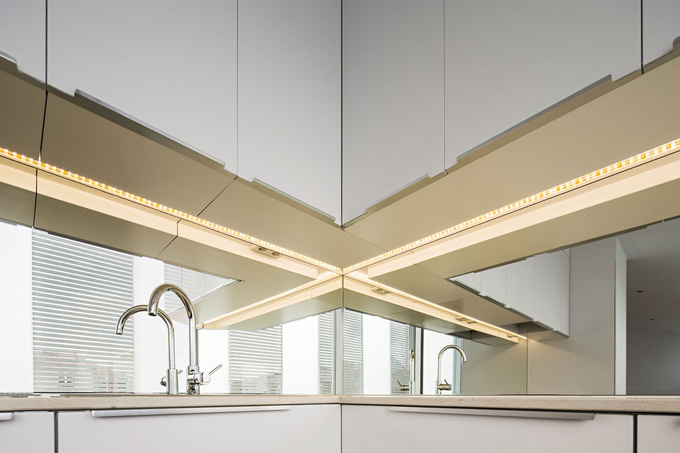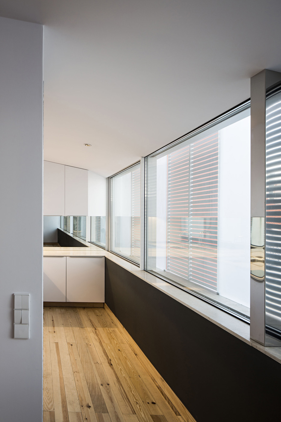 Una grande finestra orizzontale, composta da vetro, vetro traslucido e persiane scorrevoli, illumina l’appartamento