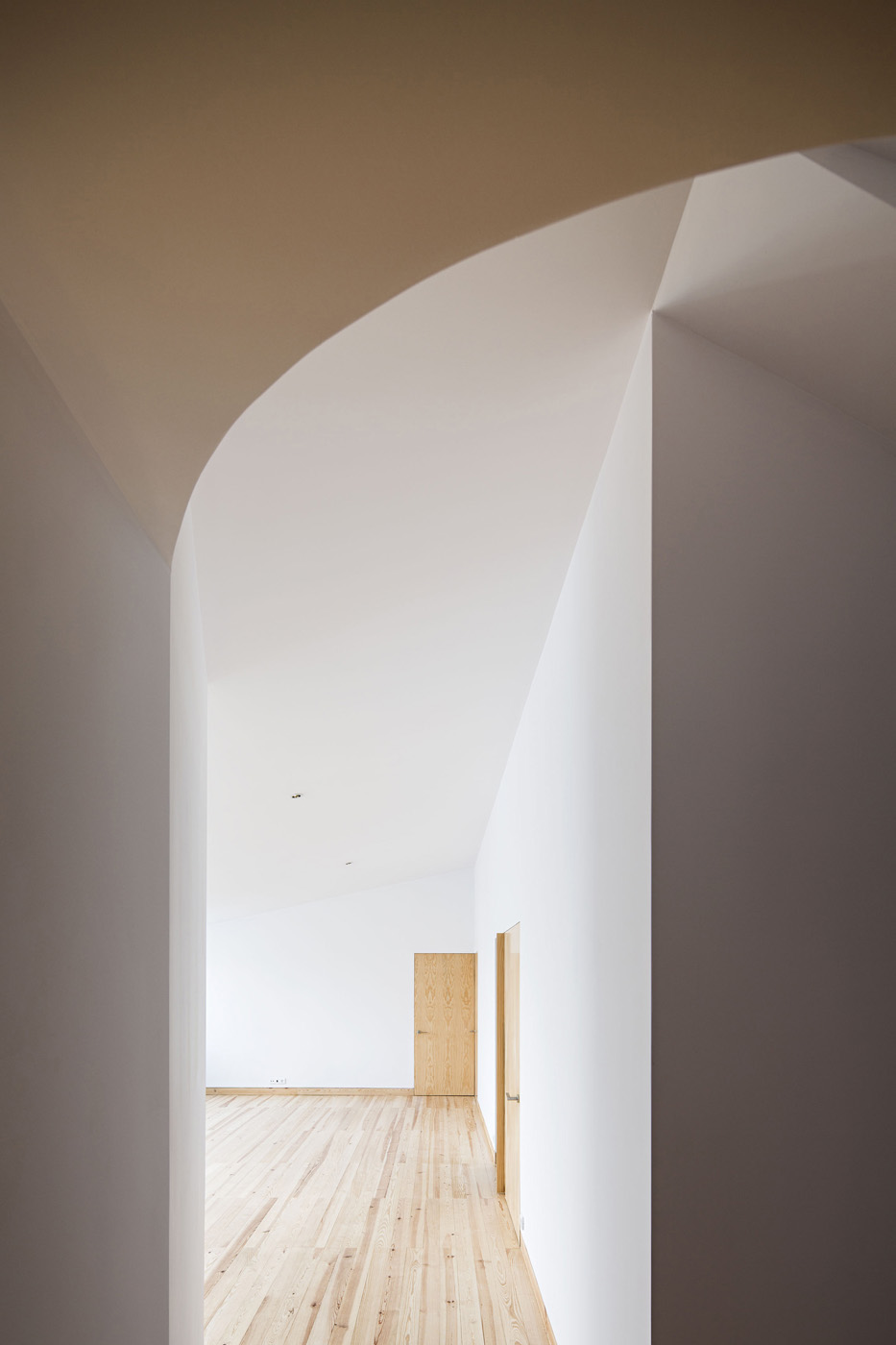 Un volume dalla forma irregolare racchiude bagni, cucina e dispensa. Gli spazi sono differenziati senza porte o corridoi, in modo semplice
