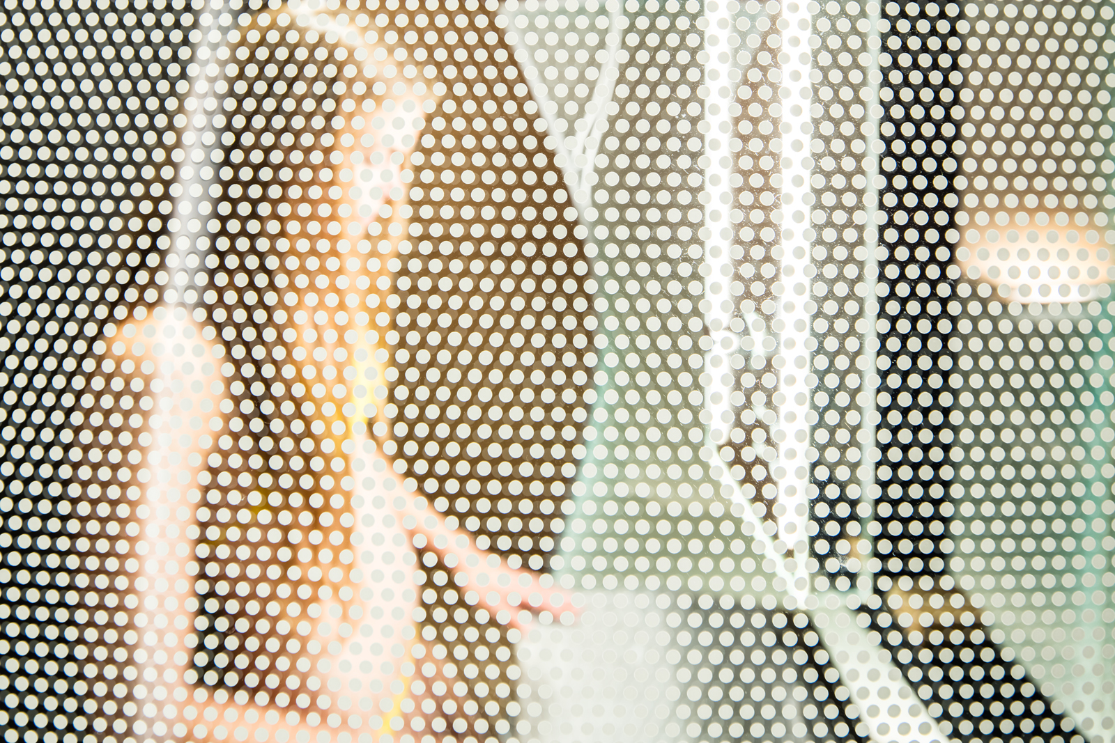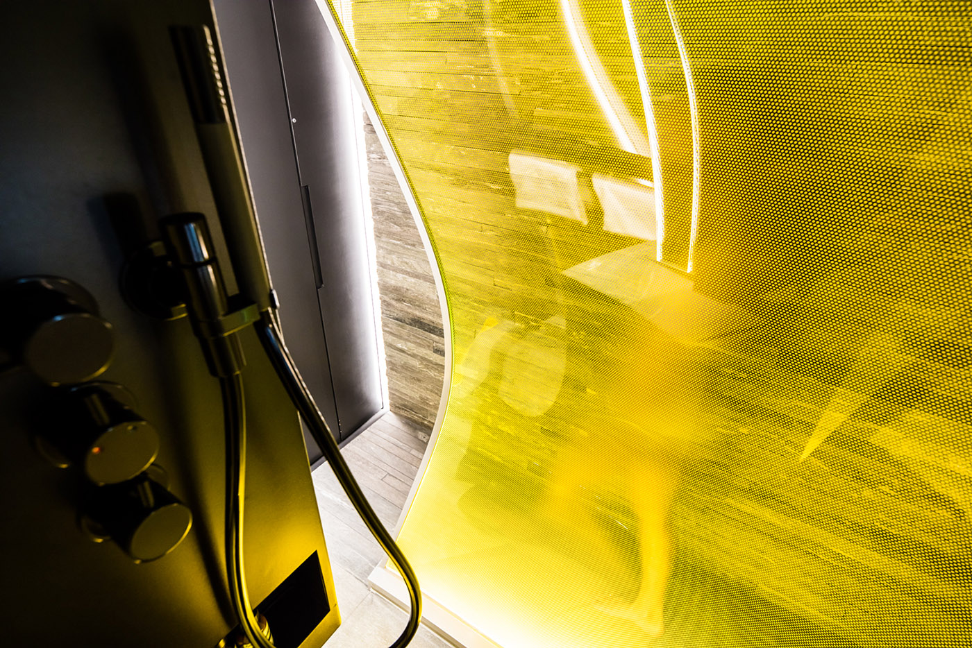 Il cuore della stanza è la doppia doccia curva, piegata a caldo, progettata da Morphosis e fabbricata da Cricursa a Barcellona, un oggetto scultoreo astratto che si erge in contrasto luminoso con le superfici naturali della stanza