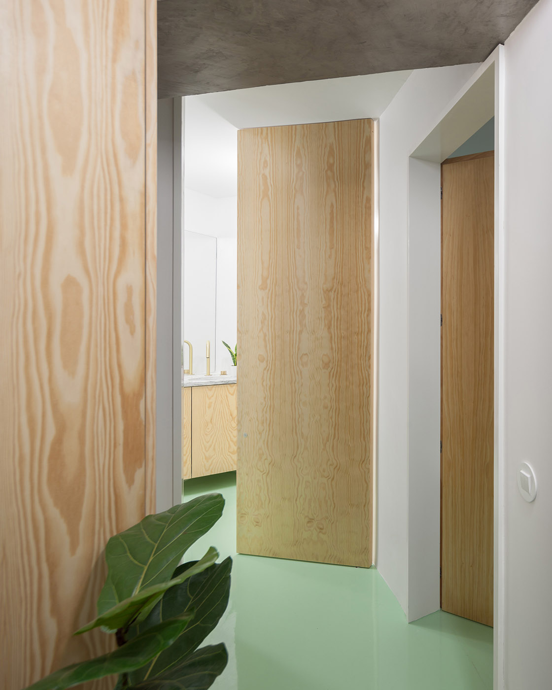 Piano di un condominio modernista riprogettato. Il pavimento verde menta lega tutti gli spazi