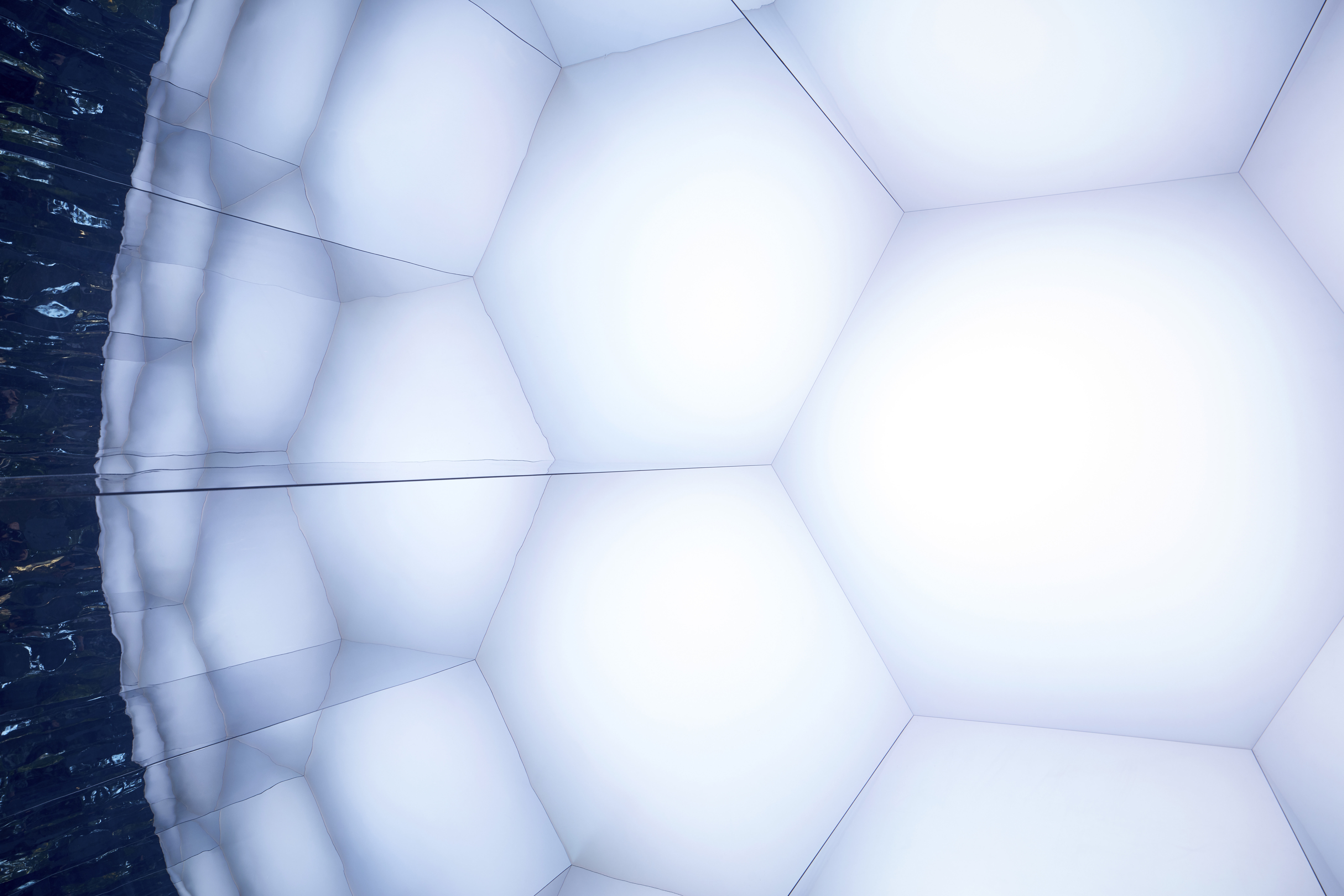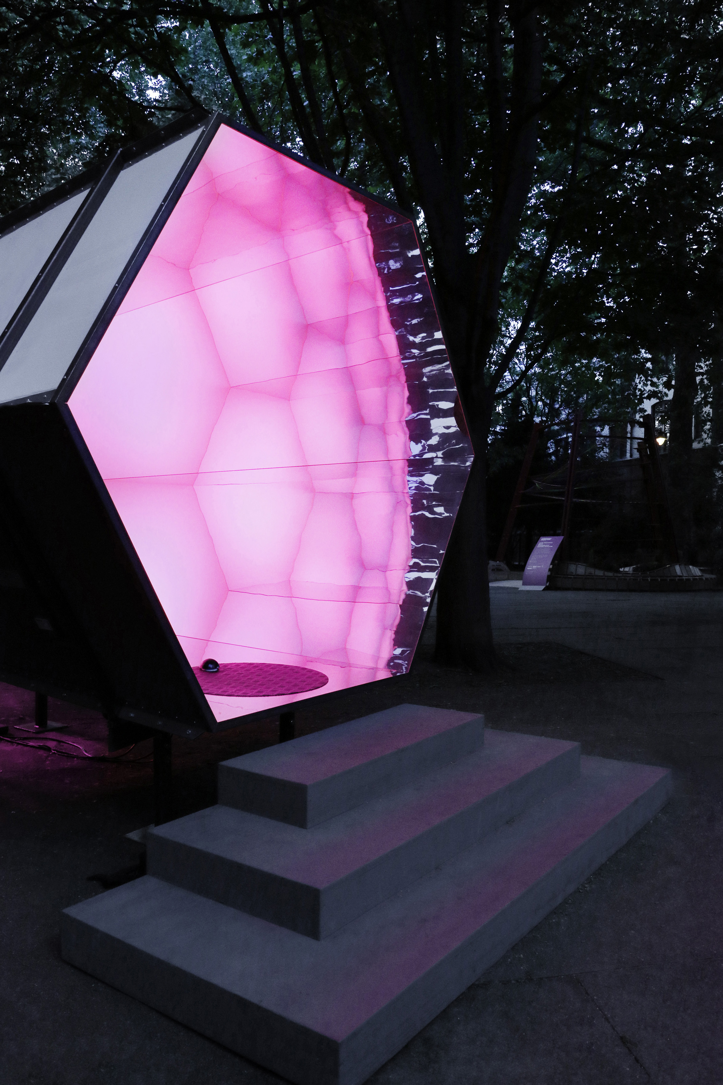 Dall'esterno viene prodotta una coreografia a colori. Dal momento che le pareti interne dell'imbuto sono specchiate, producono l'immagine di una sfera o di una sfera gigantesca, alternativamente incandescente in bianco, blu, arancione, rosso o rosa e lampeggiante in bianco