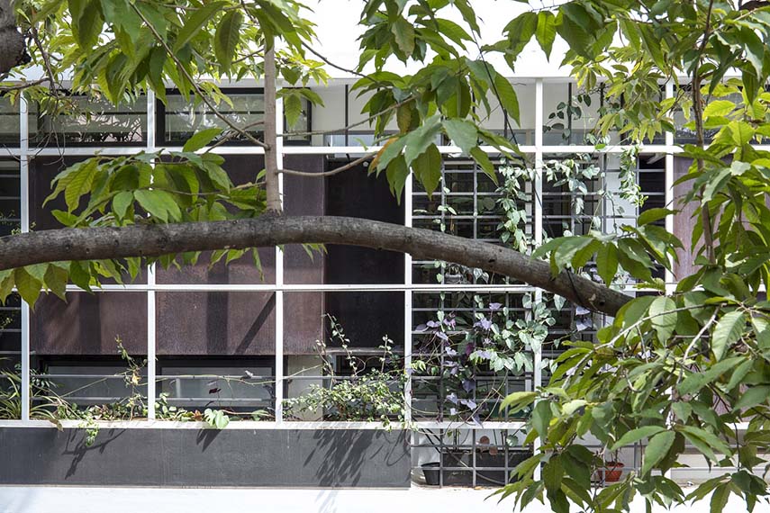 Il giardino sopraelevato diventa il cuore della casa, regalando viste piacevoli sia al piano terra che al primo piano; è'anche la fonte centrale di luce e ventilazione per la casa. Una galleria lo costeggia aprendovisi con alte porte in vetro pieghevoli. Il primo piano ruota attorno al mezzanino e ospita due camere da letto con un ampio spazio ibrido al centro che si allinea con il giardino centrale: uno spazio che funge da tana, biblioteca, area lounge, sala AV e secondo soggiorno per la coppia