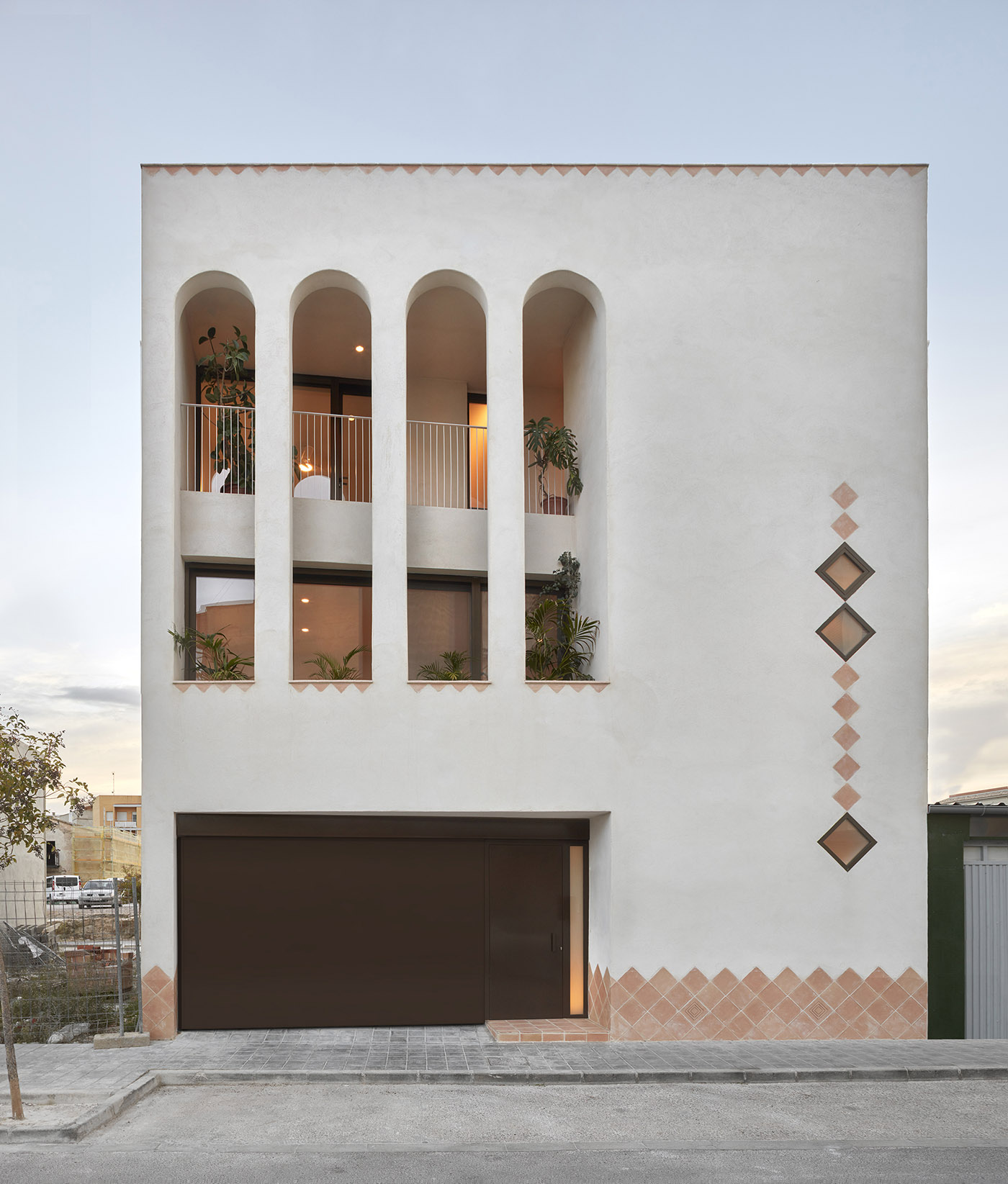 Il piano terra di servizio consente di elevare la zona giorno ad un livello che eviti i rumori esterni e possa godere di sufficiente luce naturale. La casa si sviluppa intorno a un patio centrale che divide le diverse zone abitative. Al piano superiore le camere raggiungono scorci lontani che godono dei riferimenti geografici della zona