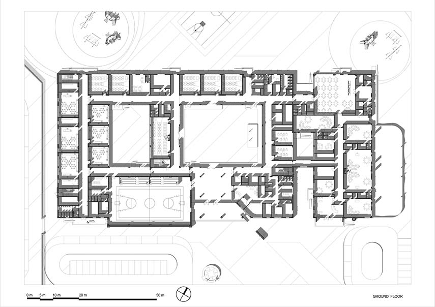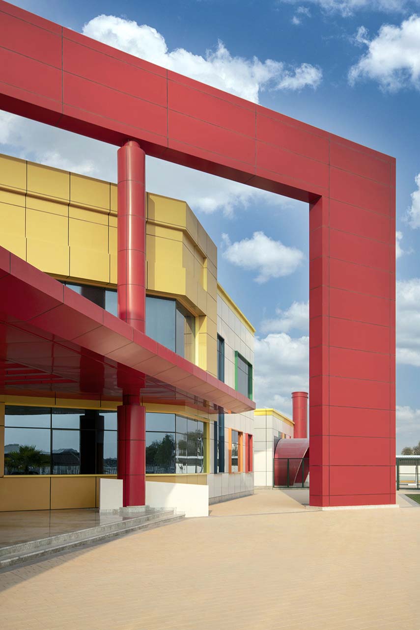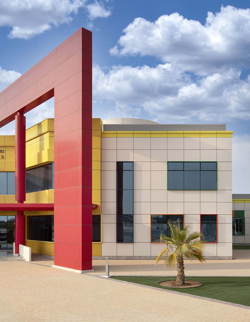 Un complesso scolastico pensato per accogliere bambine e ragazze nella piccola località di Al-Laseeli, a sud di Dubai. Il progetto, firmato dal Gruppo UPA, si distingue per essere il primo edificio pubblico progettato in BIM negli Emirati Arabi. La rigidità del modulo di 1,5 metri si traduce in un sistema architettonico ludico, fatto di volumi bianchi, geometrie colorate e cortili come spazi centrali della vita scolastica. Il modulo di 1,5 metri, vincolo imposto dal Ministero delle Infrastrutture e dello Sviluppo, diventa la base di un linguaggio architettonico giocoso. Le facciate bianche in alluminio trasformano l'intero edificio in una sorta di grande quaderno a quadretti. Le cornici colorate delle finestre, che si staccano dal piano di facciata, rompono la rigidità compositiva, suggerendo un gioco di forme pensato per stimolare la percezione e la curiosità dei più piccoli.