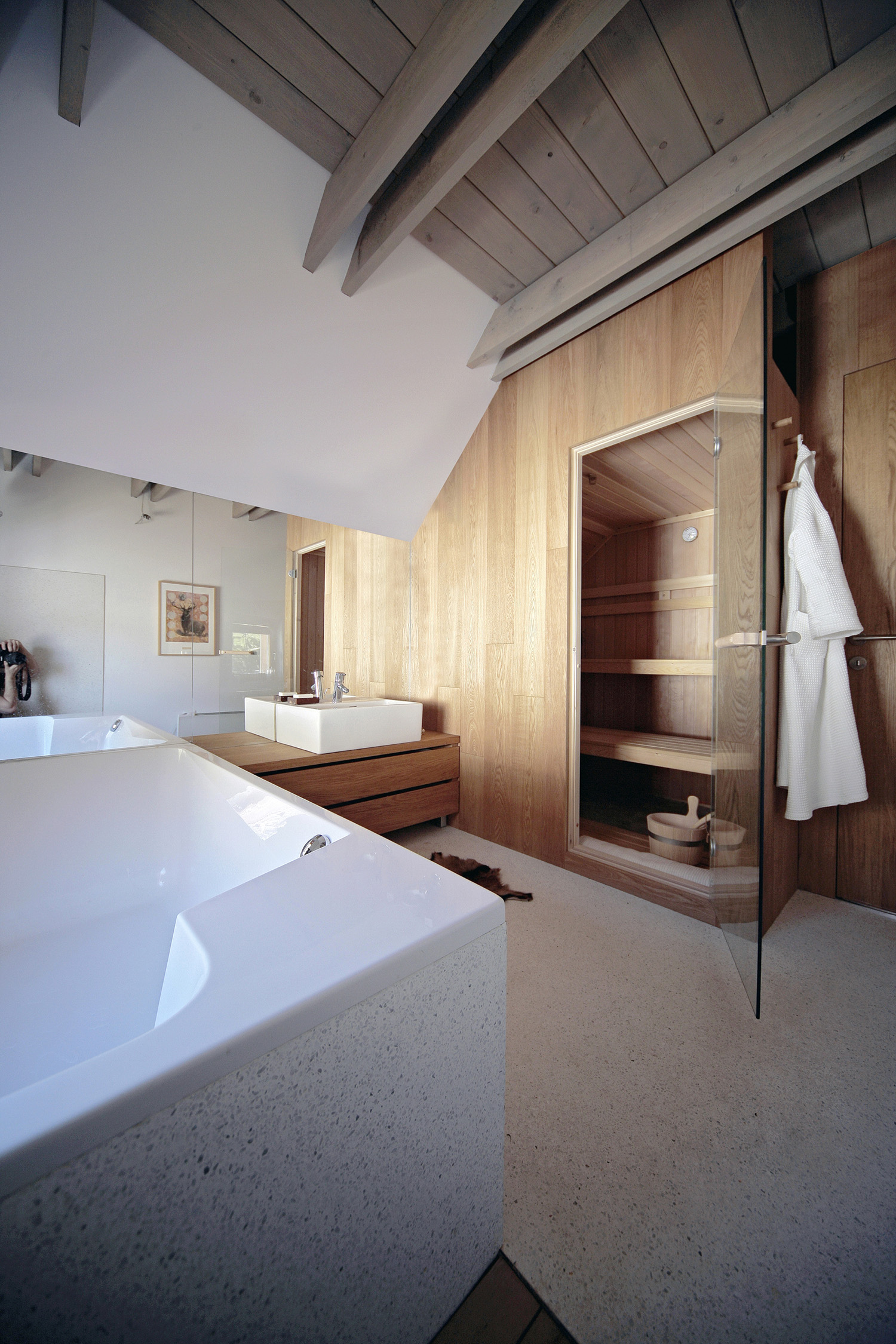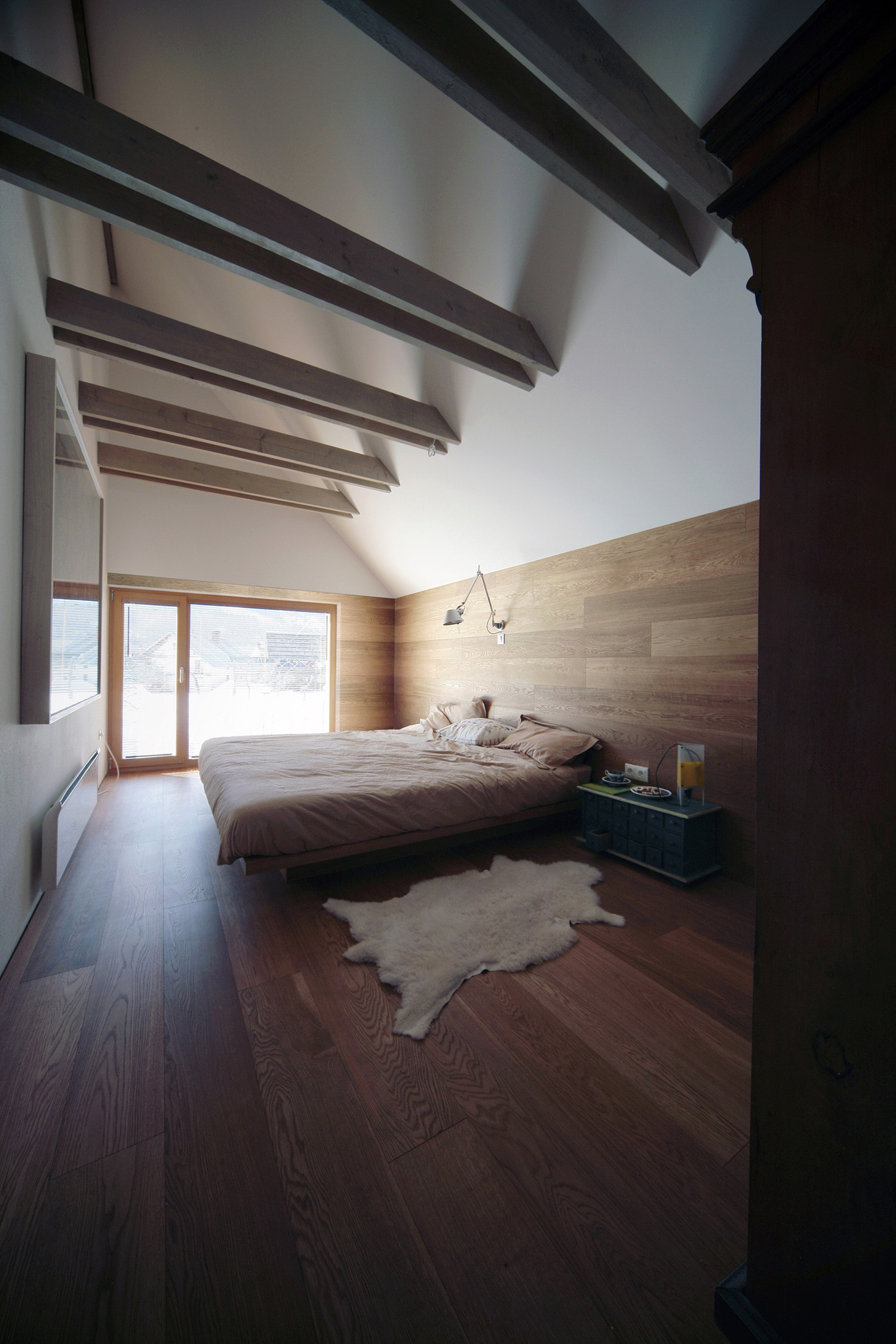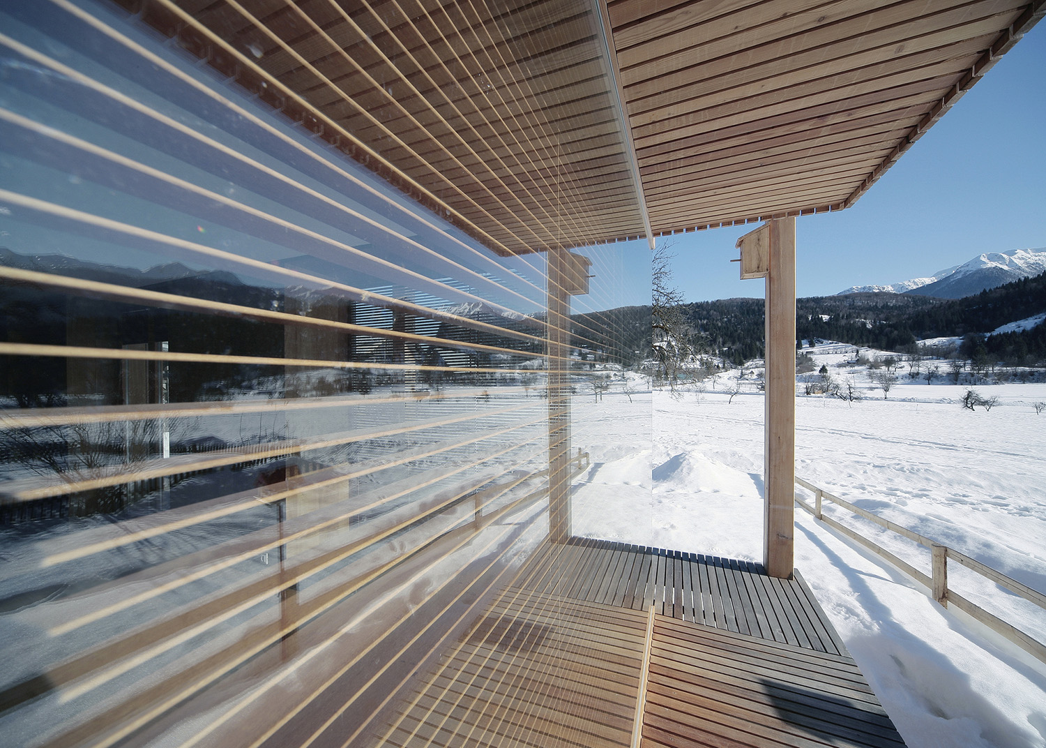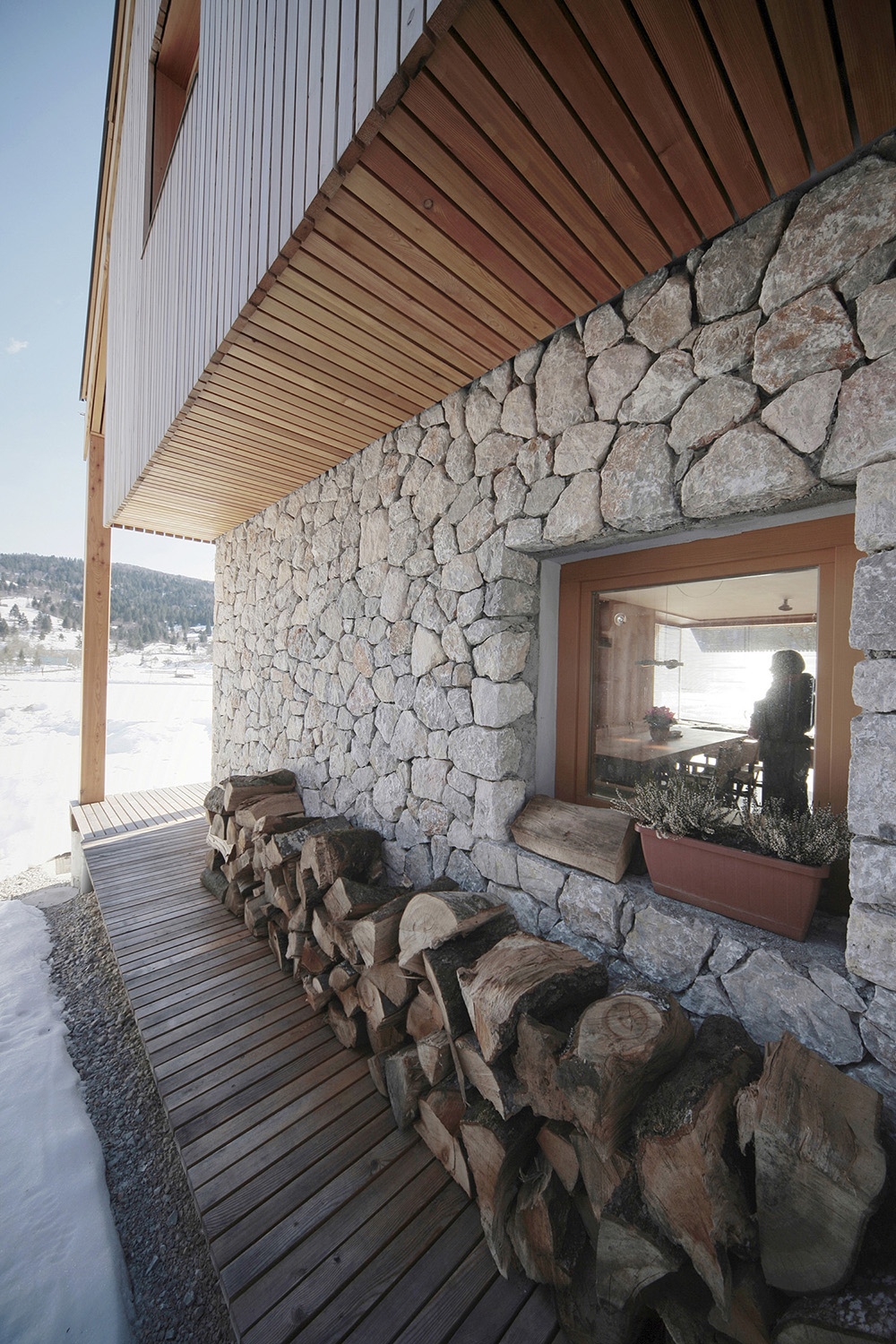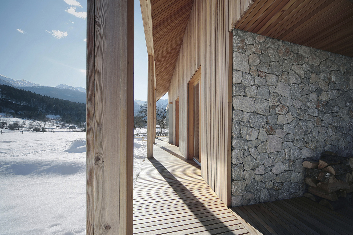 Il volume di 6x11 metri resta lo stesso, come anche il tetto inclinato di 42°. Le colonne in legno e la terrazza perimetrale, che costituiscono gli elementi aggiuntivi, fanno riferimento alla tradizione locale, in particolare ai fienili delle zone vicine piuttosto che alle abitazioni. Inoltre, l’abitazione viene dotata di grandi aperture affacciate sul panorama