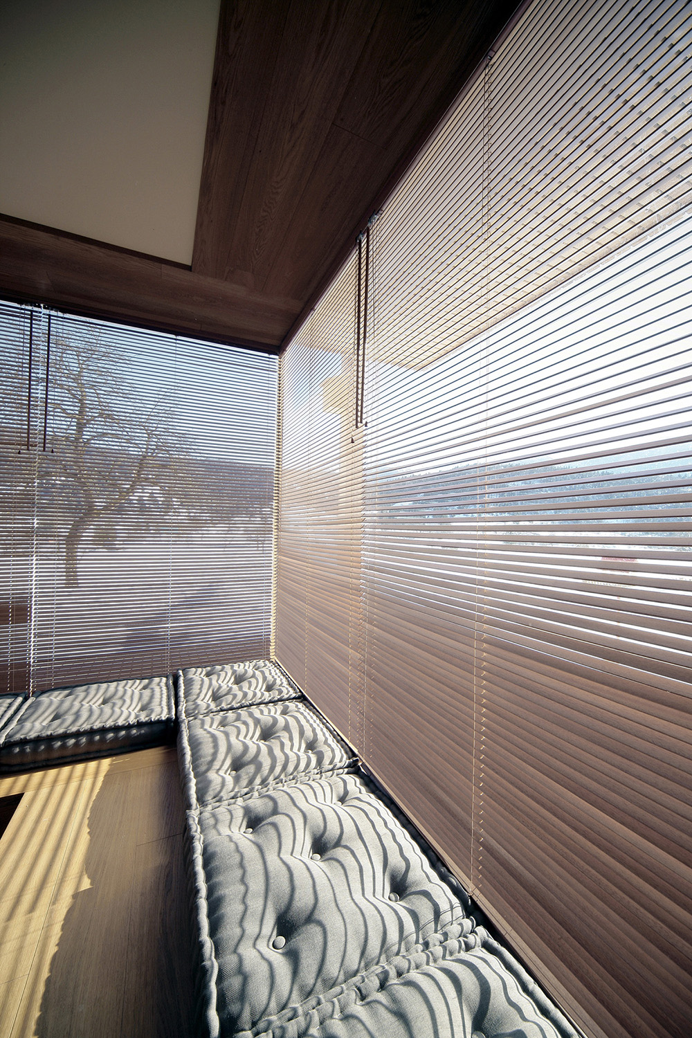 L’interno, reinterpretazione di una generica capanna alpina, si adatta alle esigenze della famiglia ed è molto razionale. Un camino, attorno a cui ruota una scala centrale, riscalda i due piani. Il piano terra è costituito da un’unica stanza, in cui c’è la cucina e il soggiorno, e il davanzale si trasforma in una seduta da cui poter ammirare il panorama. Nel primo piano ci sono tre camere da letto e un bagno con sauna