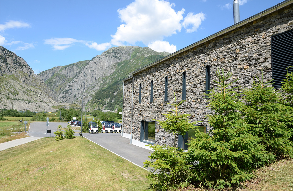 Le pareti dell’edificio sono state realizzate con Murogeopietra modello Valdostano posato a secco, che mette in risalto l’elegante linearità della costruzione, valorizzando e disegnando i pilastri della grande veranda. Come da esigenze progettuali, murogeopietra modello Valdostano, nella tonalità Grigio Chiaro, si integra perfettamente al contesto naturalistico che lo circonda, armonizzandosi alla perfezione con le sfumature dell’ambiente montano