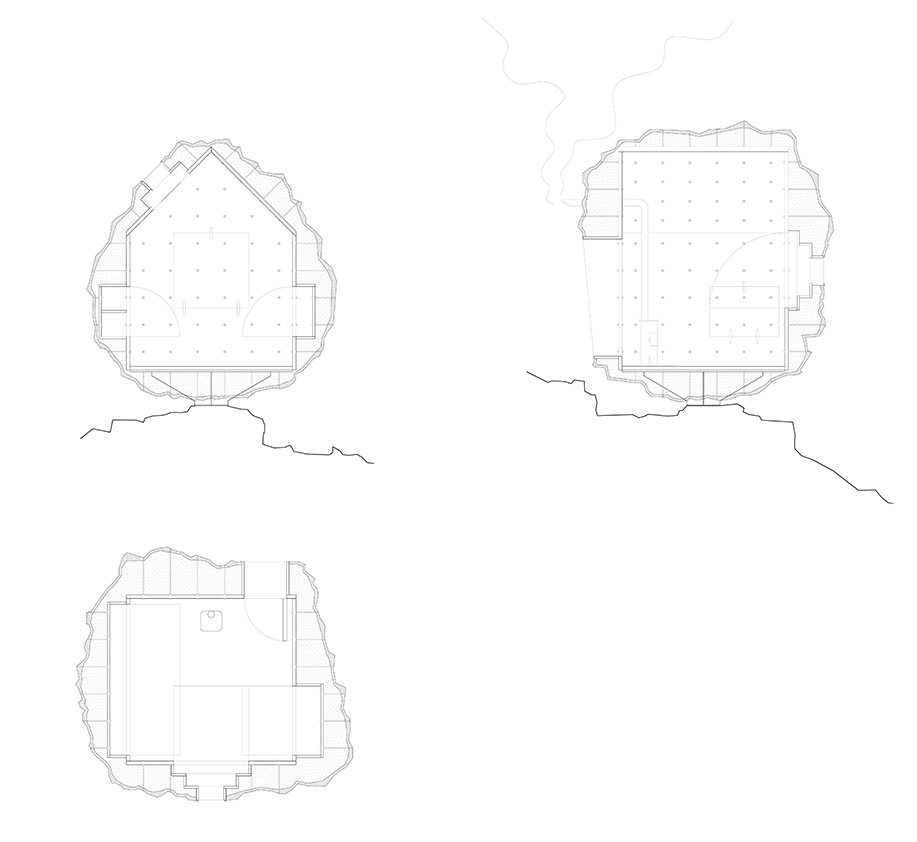 E’ un rifugio alpino, un precario «Existenzminimum» un po' sovversivo nel suo uso dove si può entrare e nascondersi liberamente. Contiene gli elementi architettonici basilari, caminetto, letto, tavolo, sgabello, finestra, ma provoca un pò di tensione in quanto la roccia pende sul campo di caduta