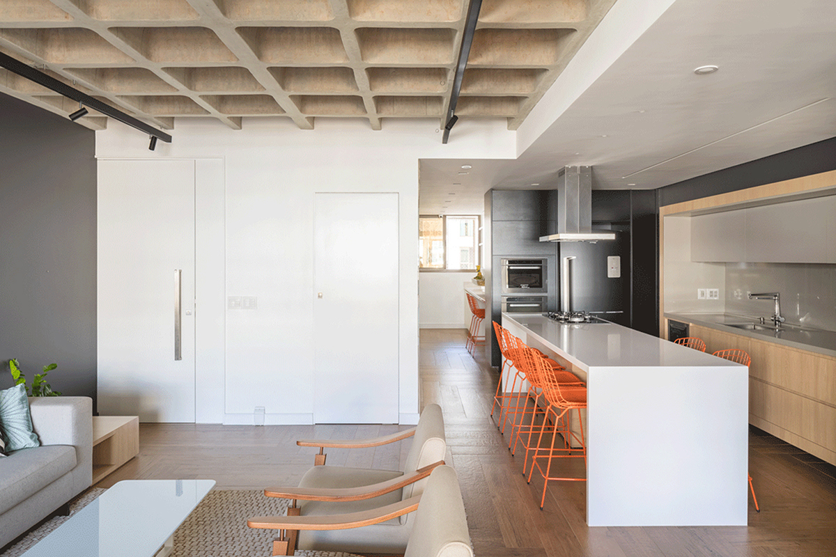 La ristrutturazione di questo appartamento cerca di aggiornare l'impianto e migliorare l'ingresso la luce naturale. Il layout originale delle unità dell'edificio soffriva di una distribuzione degli spazi molto scarsa: cucina chiusa e buia e una difficile ventilazione a causa della forma ad “L”