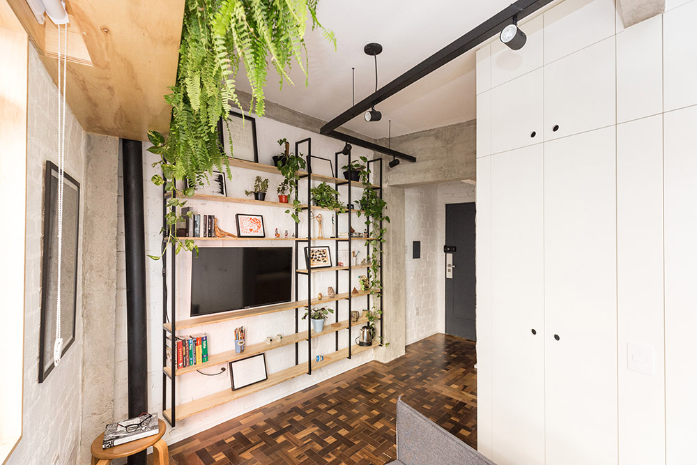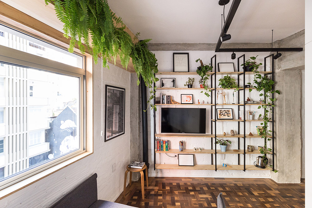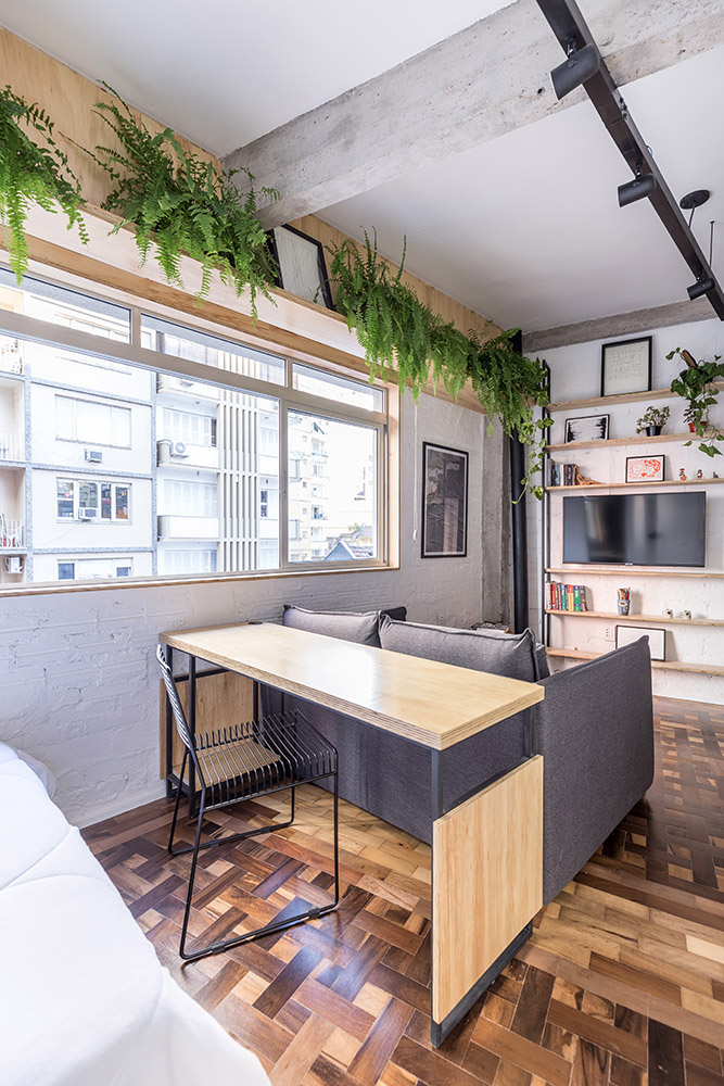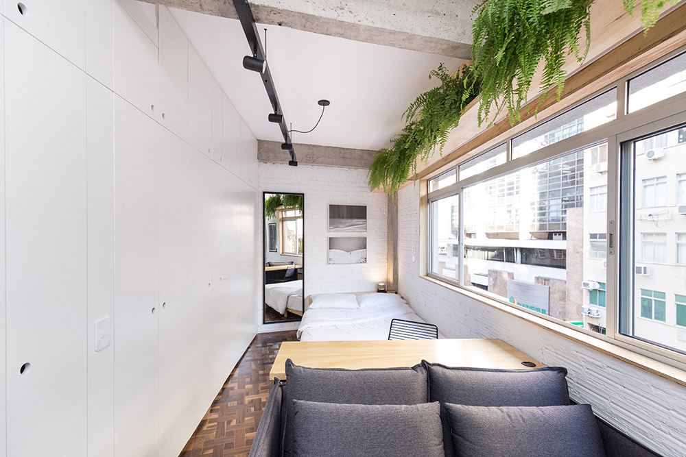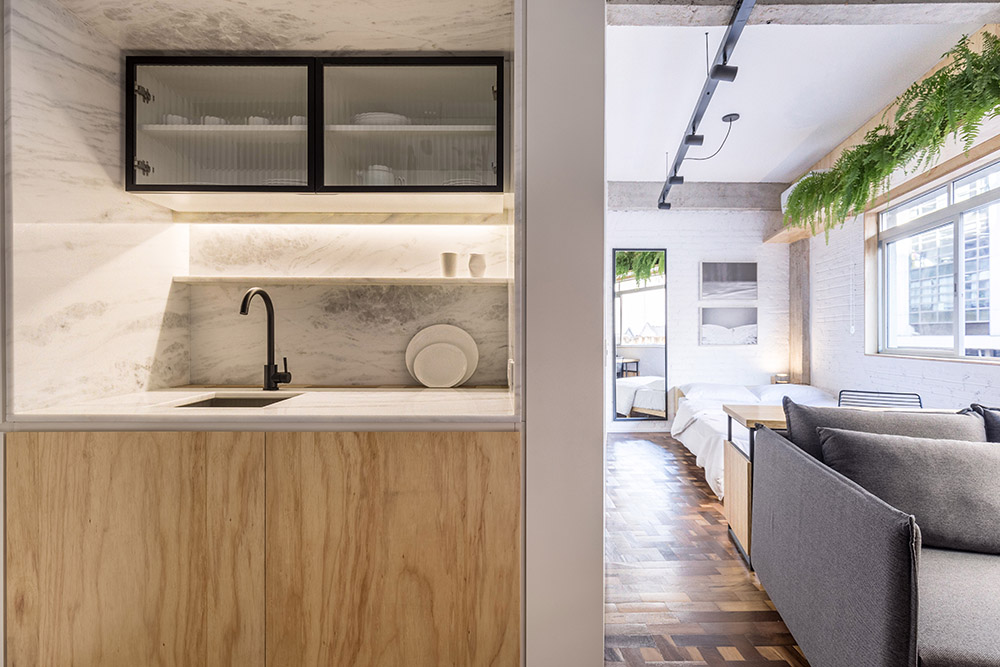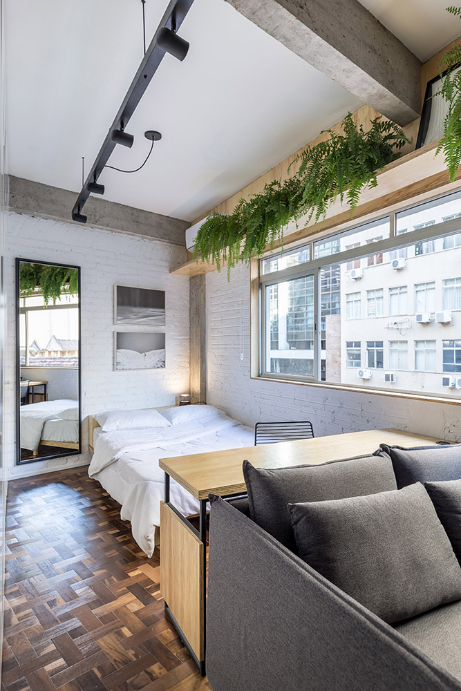 L'appartamento di appena 30 mq, progettato dall'Atelier Aberto Arquitetura, si trova nel centro storico di Porto Alegre, in Brasile, all'interno di un hotel, che decide di trasformare diverse camere d'albergo in piccoli alloggi temporanei
