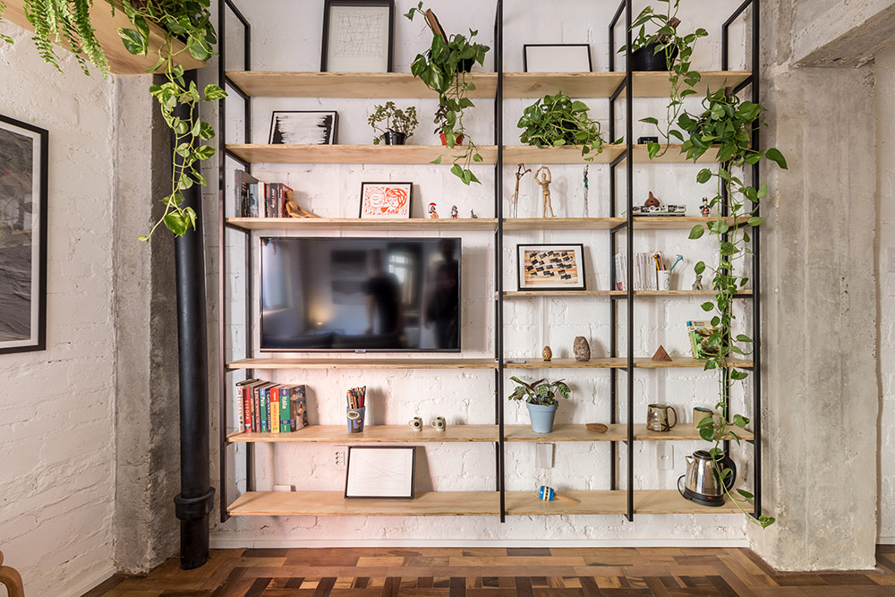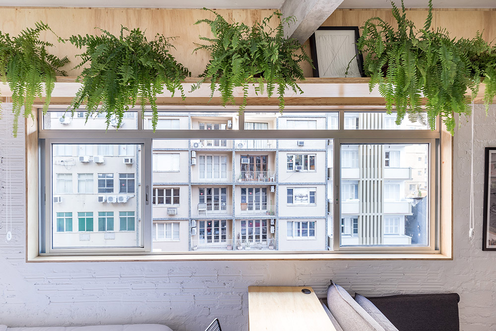 Il flusso principale dell'appartamento viene accompagnato anche dall'illuminazione, un profilo industriale dipinto di nero a forma di L. Degli scaffali molto minimal ospitano libri, piante e oggetti decorativi. La finestra, dal telaio ligneo, si affaccia sulla strada e sul palazzo di fronte