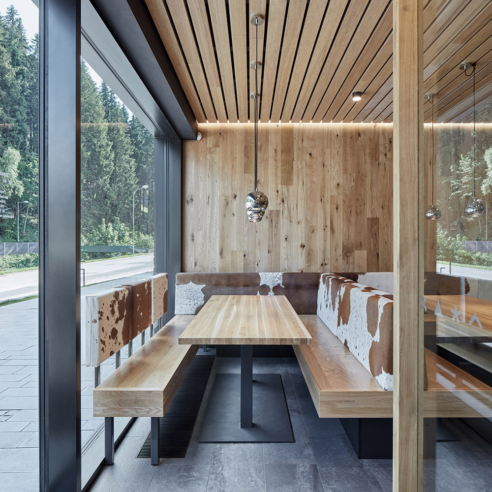 I quattro edifici sono stati costruiti su un lotto che ospitava un ex negozio degli anni '80, mantenendo la stessa linea di design del contesto originario. Questo intervento rappresenta uno dei più interessanti progetti di architettura, poiché unisce il rispetto per la memoria del luogo a soluzioni contemporanee. Il piano terra commerciale è stato trasformato in un prato sopraelevato, creando uno spazio verde su cui si ergono le quattro palazzine. All'interno di questi edifici sono stati realizzati appartamenti di diverse dimensioni da parte dello studio ov architekti e con differenti orientamenti, offrendo un'ampia varietà di soluzioni abitative.