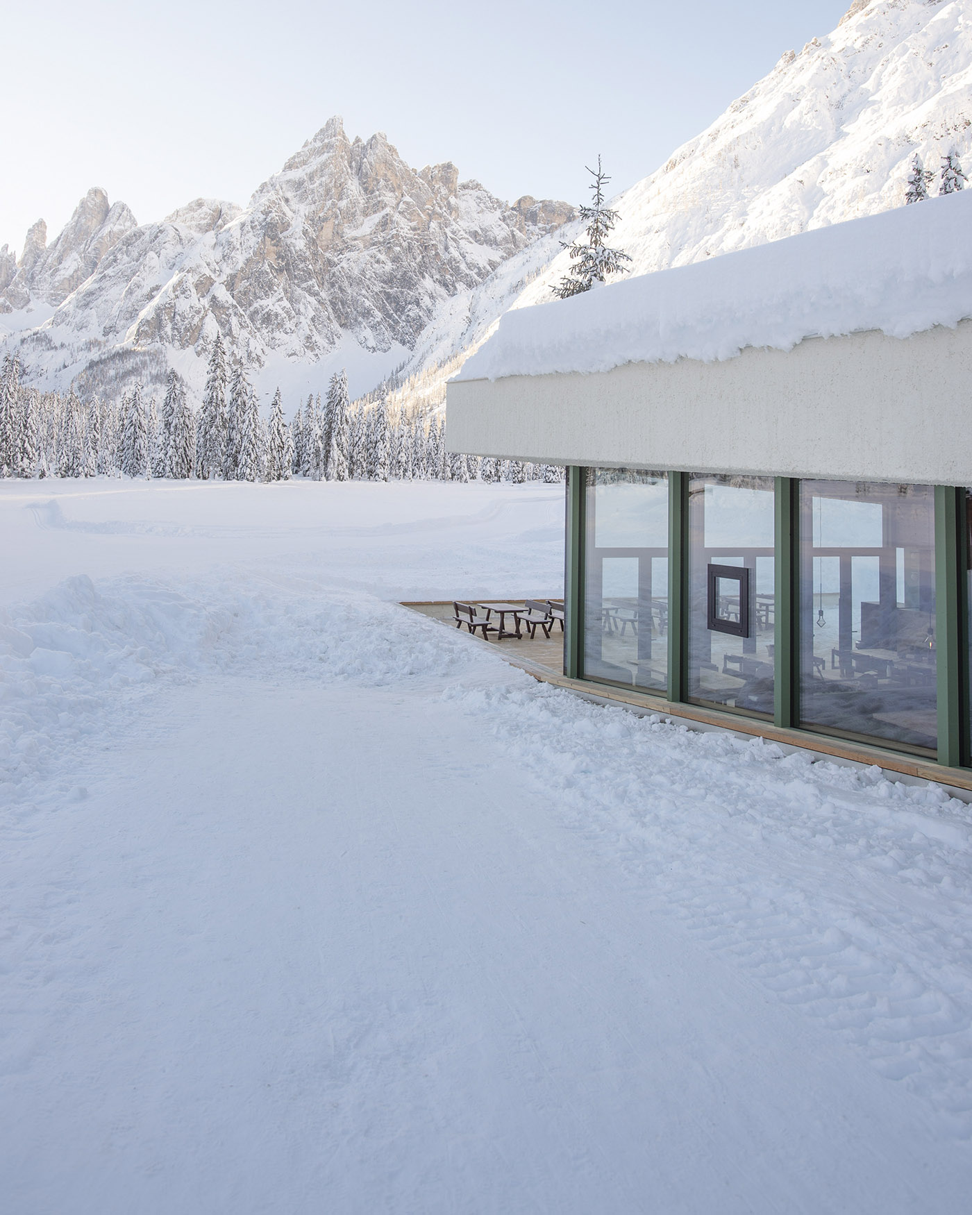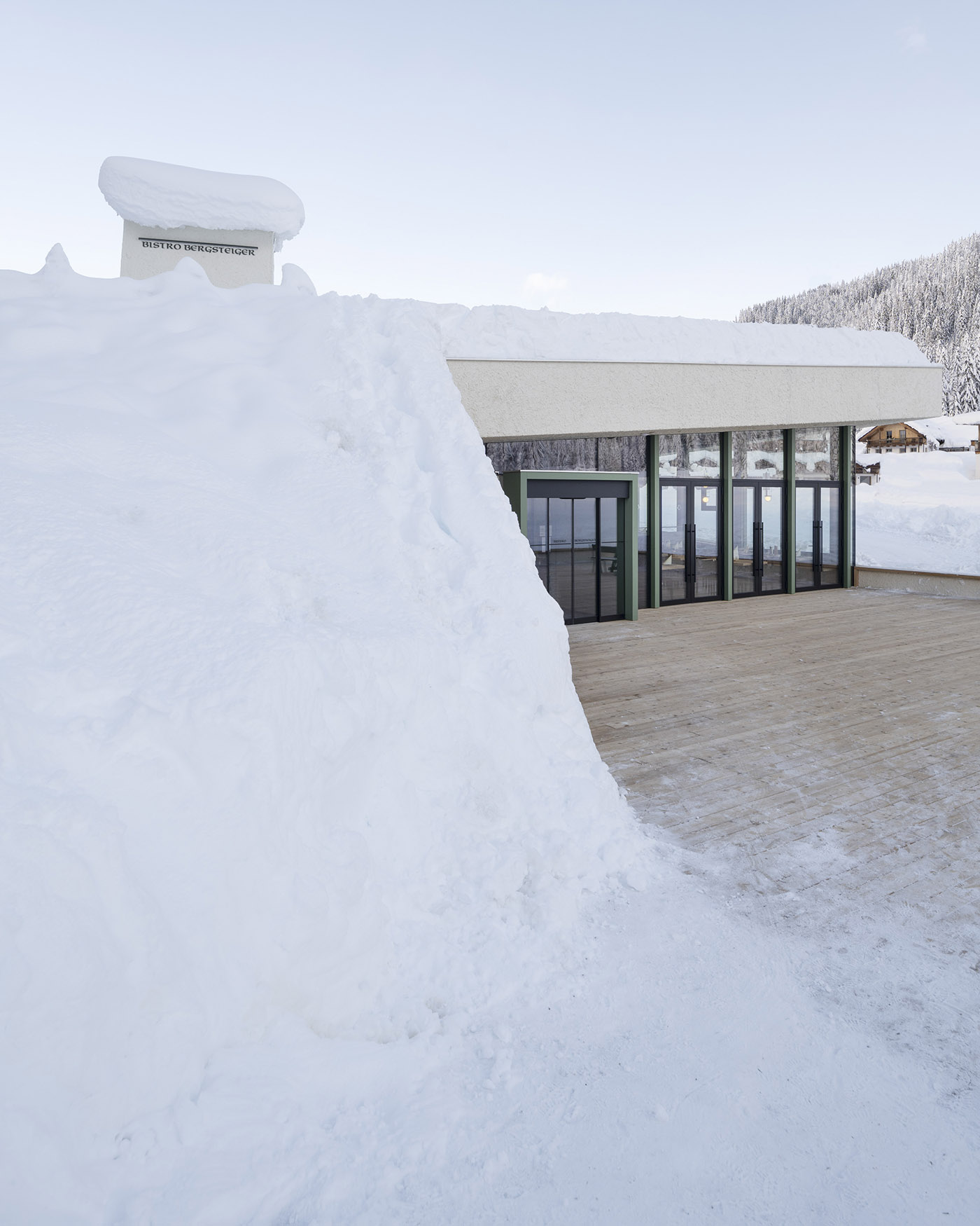 Bistro Bergsteiger si orienta da un lato verso la vista della cima 12 a sud, dall’altro verso gli edifici circostanti: in pianta, Plasma Studio riprende gli allineamenti con il volume tutelato, mentre le altezze ridotte sono definite per rispettare il disegno del prospetto complessivo degli elementi costruiti