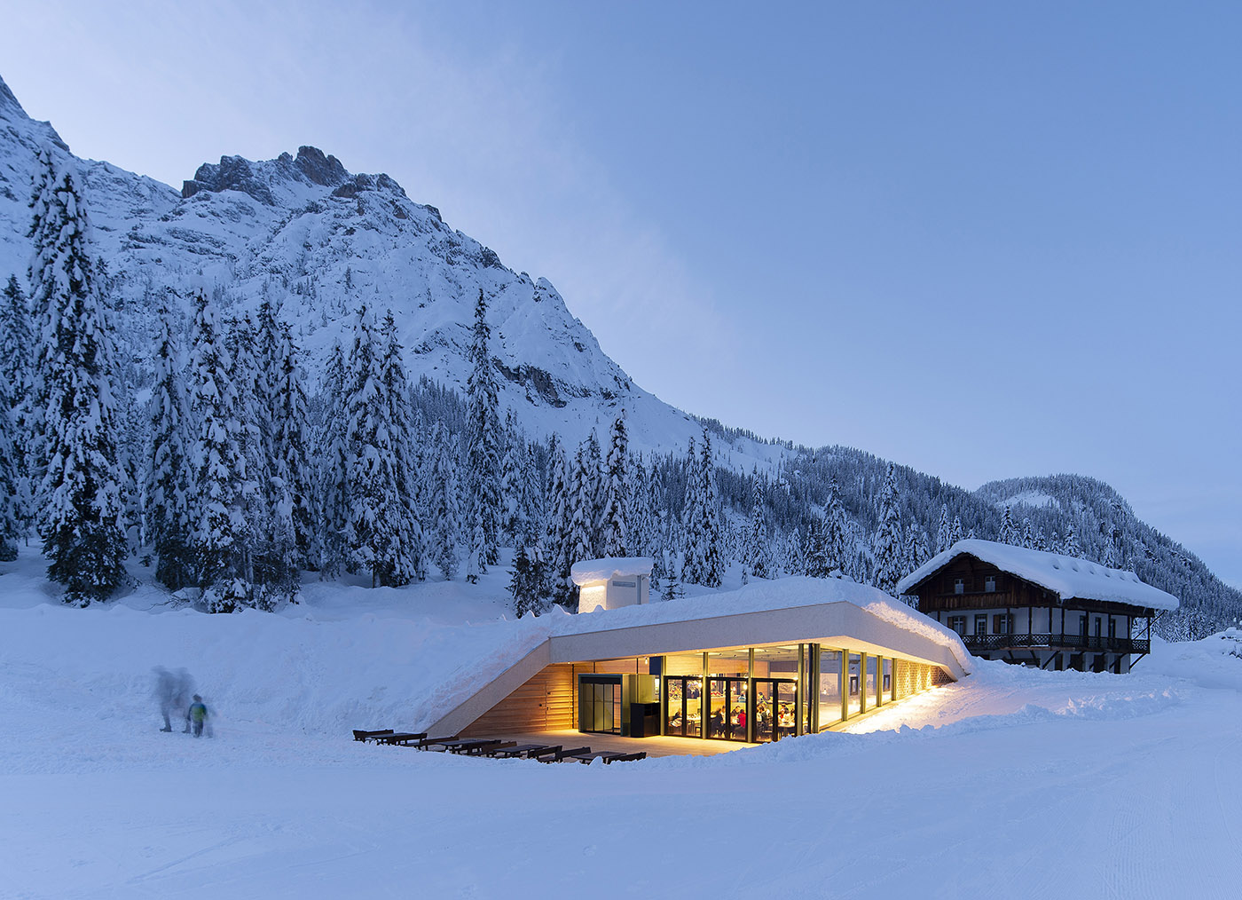 Collocato al centro del Patrimonio Naturale Unesco delle Dolomiti di Sesto, il Bistro Bergsteiger si inserisce adeguatamente e con attenzione nel suo contesto naturale e costruito: il bordo di un terrapieno, collocato lungo un sentiero escursionistico ben battuto, viene utilizzato per inserire il nuovo volume ed integrarlo nella topografia circostante