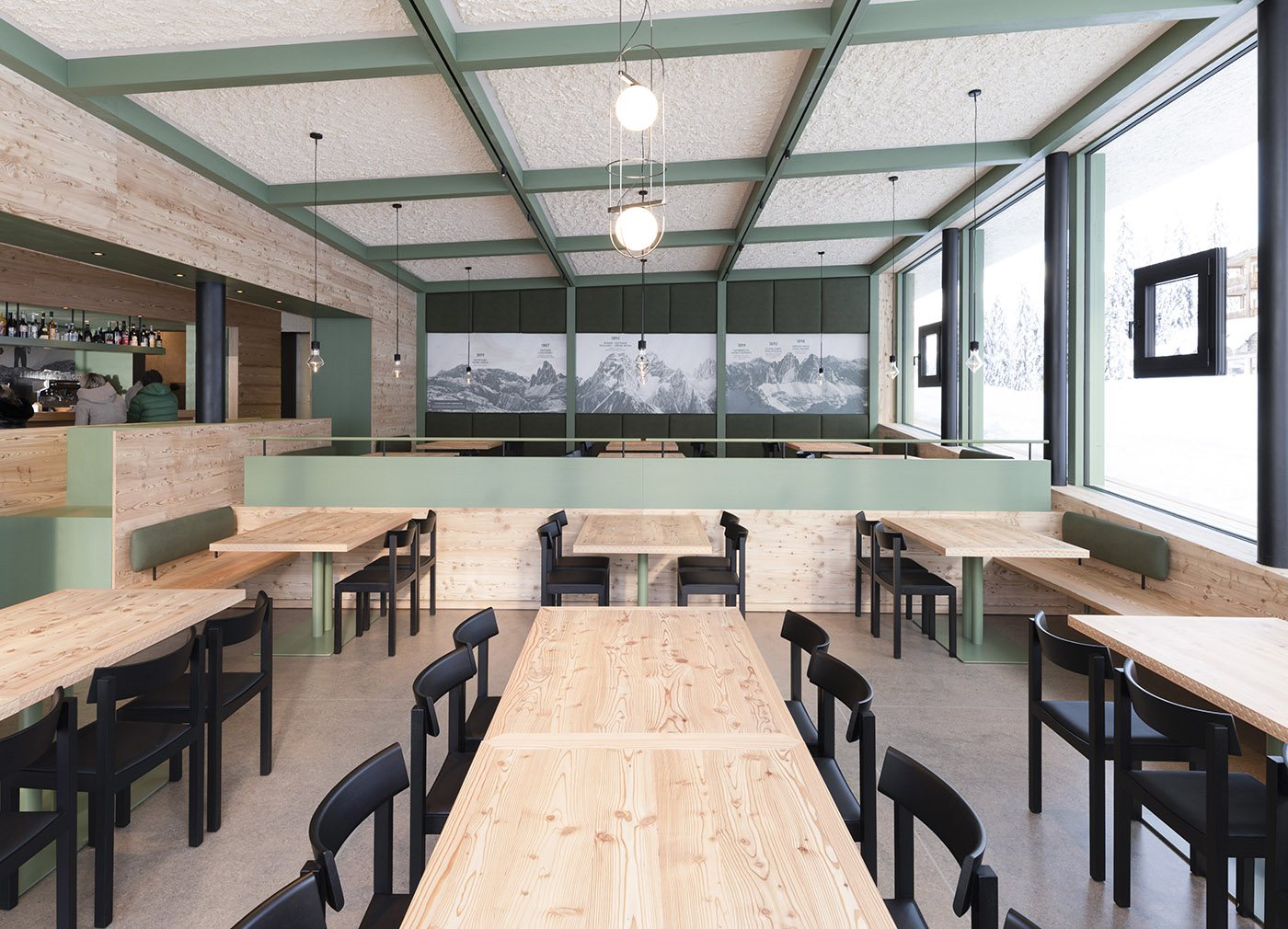 L’interno offre a quanti più visitatori possibile una vista indisturbata sulle montagne; la sala principale è suddivisa spazialmente nel bancone, nello spazio di circolazione, e nelle due aree ristorante distinte, che creano intimità, tranquillità e consentono un’ampia visuale grazie alla differenza di quota tra i piani