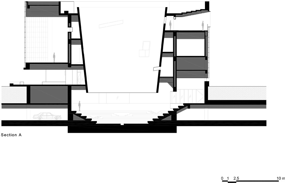 All'interno della massa spessa del volume dell'edificio c'è una serie di spazi interconnessi che i visitatori possono visitare liberamente, salendo lentamente, godendo di un viaggio coreografico con viste dirette sia verso l'interno che verso l'esterno. Un percorso a spirale conduce attraverso tutti gli spazi, creando un aspettativa ad ogni cambio di prospettiva. Partendo dalla parte inferiore con il Café, si passa per la Multi-purpose Gallery e un Anfiteatro all'aperto, il percorso guida i visitatori attraverso cinque gallerie distinte, culminando sul tetto dove si ottiene una visione a 360 gradi delle attività sottostanti