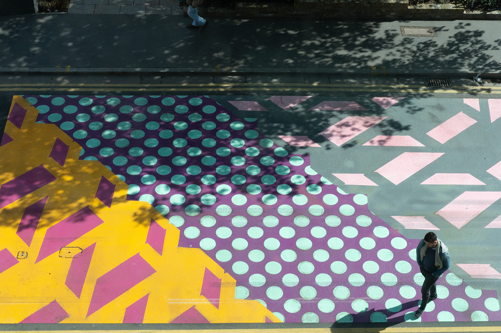 Per Adam Nathaniel Furman la città intorno a noi è la più grande galleria del mondo, della vita, dei materiali, delle composizioni. Crea così una composizione grafica urbana invitando a “guardare in alto e a guardare in basso”. Look Down To Look Up
