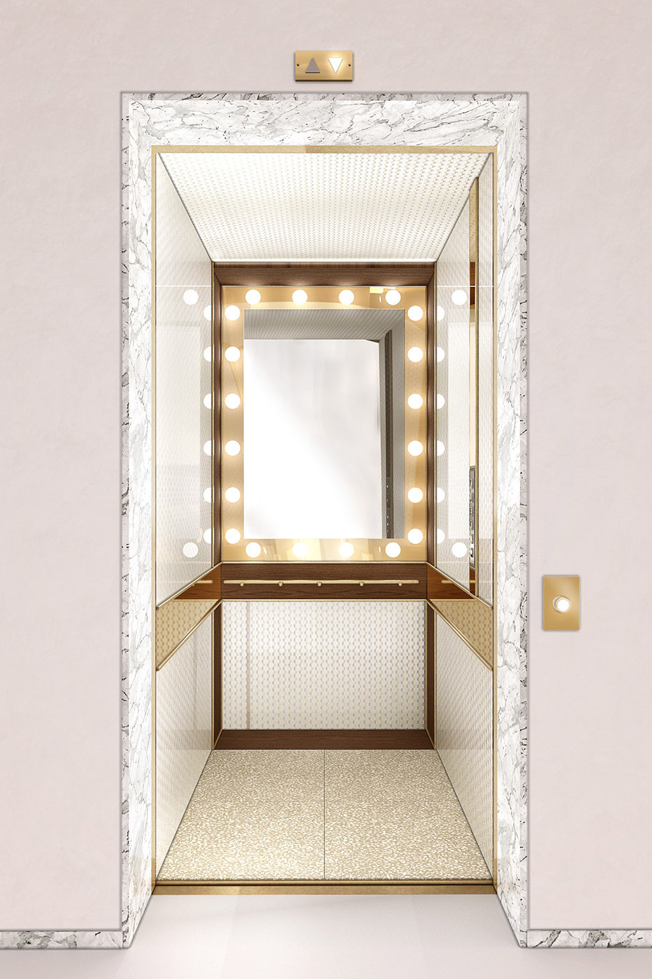 Il primo, Belle Epoque, onirico ed elegante, esprime un chiaro richiamo alla ‘poetica’ dei film di Wes Anderson”. Il secondo, Golden Age, si ispira ai vecchi film in bianco e nero, dove in ascensore era presente il “lift boy” che accompagnava l’ospite al piano. È un omaggio all’ascensore e al suo immaginario. Questo spazio elegante è fortemente caratterizzato da una carta da parati geometrica (tratta dalla collezione Eterea per Zambaiti Parati) completata da specchi e metalli che ne esaltano la profondità
