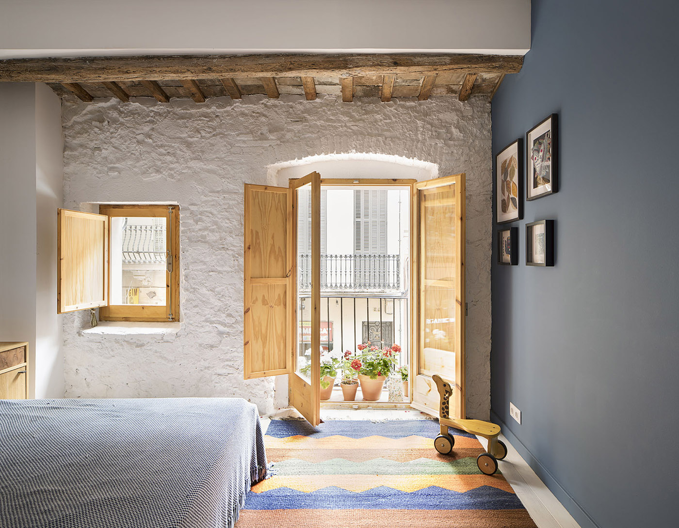 La facciata color sabbia ha tutta la bellezza di una classica casa catalana: un gradino in cotto, una porta in legno naturale, un'incantevole finestra con balcone e ordinate finestre incorniciate. Il piano di nuova costruzione si fonde perfettamente sia con la proprietà stessa che con quelle adiacenti. La piastrellatura a lisca di pesce è stata usata abilmente in questa sezione: attraente e simpaticamente colorata per integrarsi con gli edifici vicini