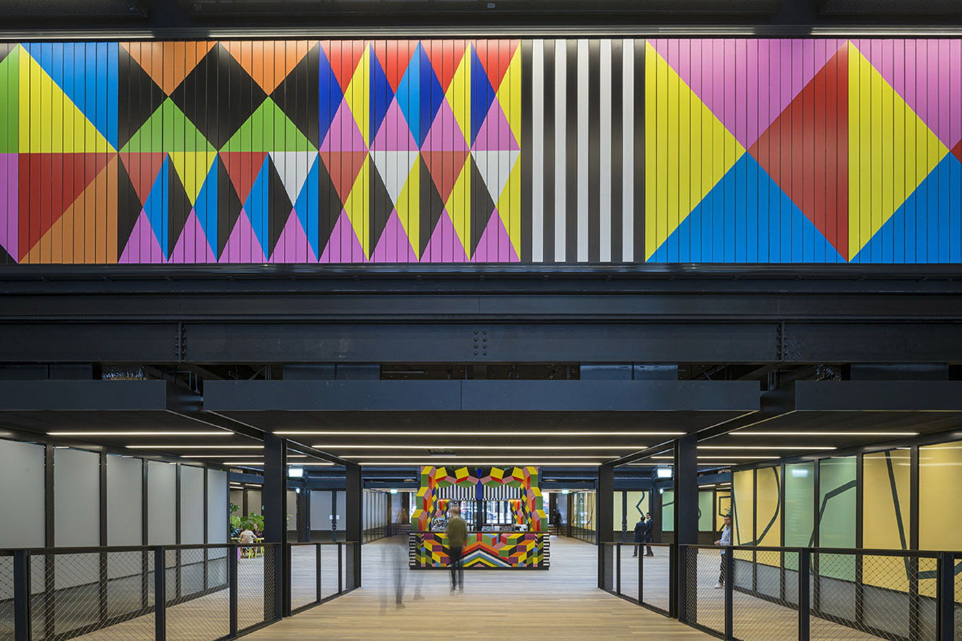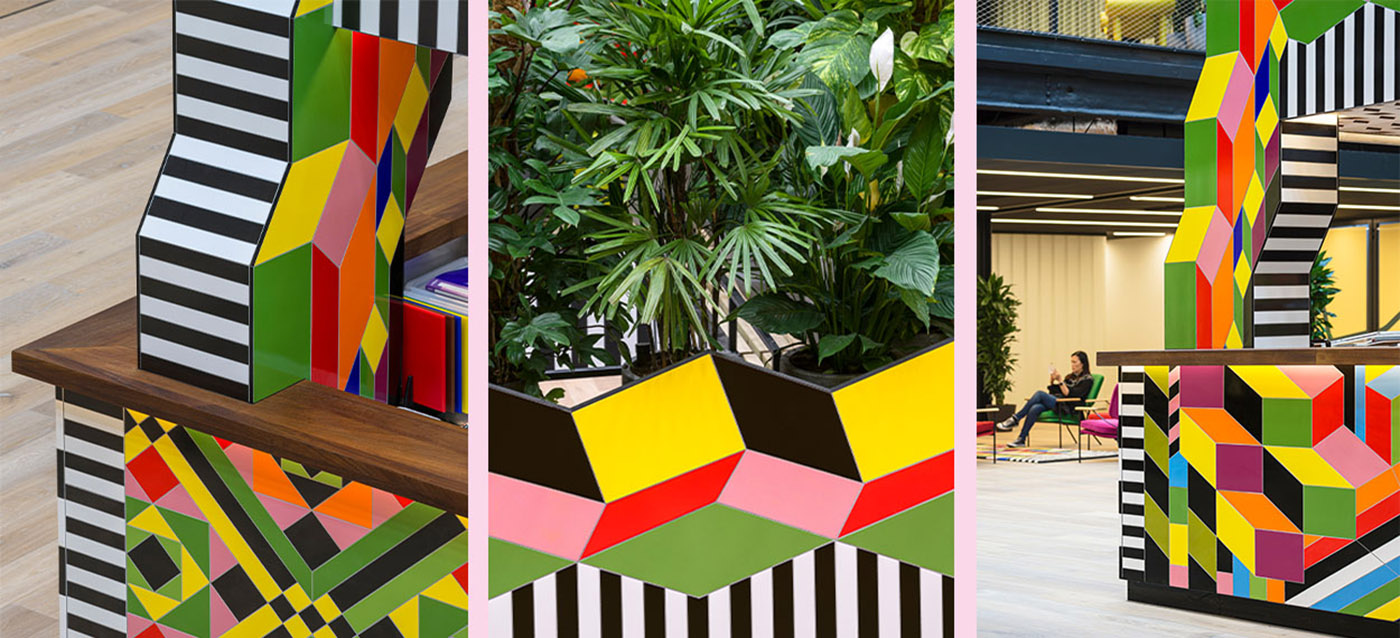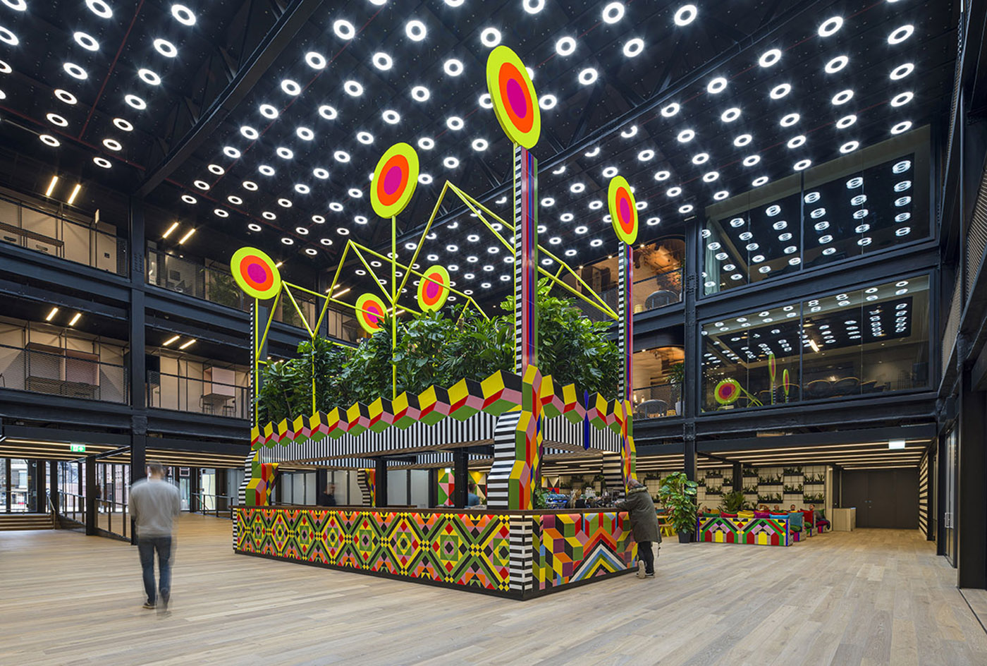 Punto focale delle installazioni artistiche è il coloratissimo Atoll che incoraggia il pubblico ad utilizzare il nuovo percorso inaugurato di recente. Il livello inferiore di Atoll è occupato da una caffetteria mentre il livello superiore riprende il profilo di tre case a schiera di Londra. Proprio la città di Londra ha ispirato Morgan Myerscough avendoci vissuto tutta la sua vita.