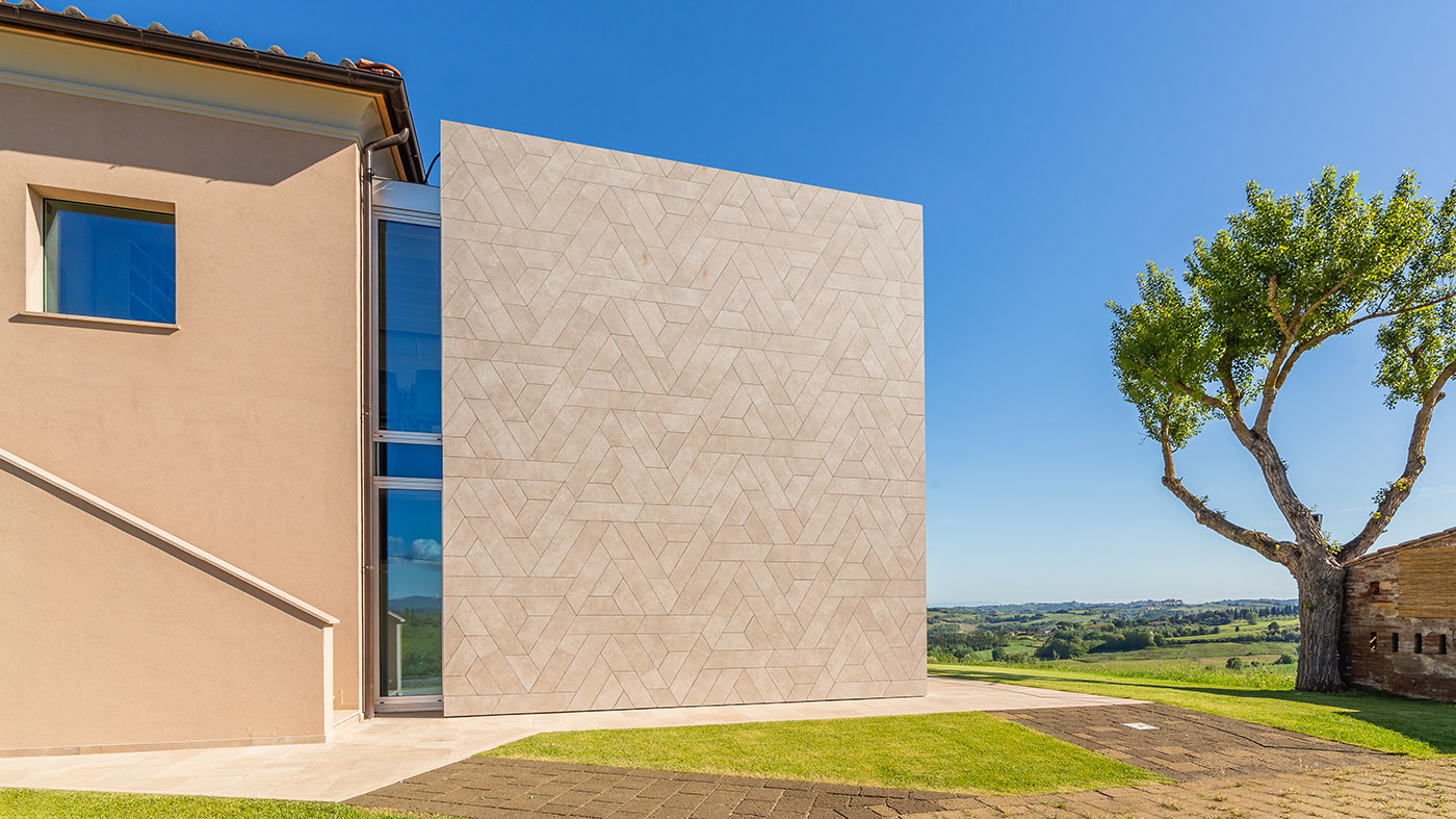 Biblioteca di Peccioli. Rivestimento geometrico in gres porcellanato per l’ampliamento