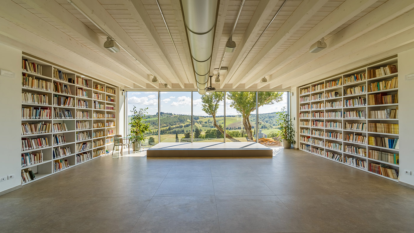 Immersa nel verde, la biblioteca di Peccioli è costituita da due volumi., la parte storica restaurata e il nuovo volume contemporaneo. La facciata ventilata è rivestita di gres porcellanato Porcelaingres, custom-made, realizzato seguendo il progetto di Heliopolis 21 Architetti Associati di Pisa.