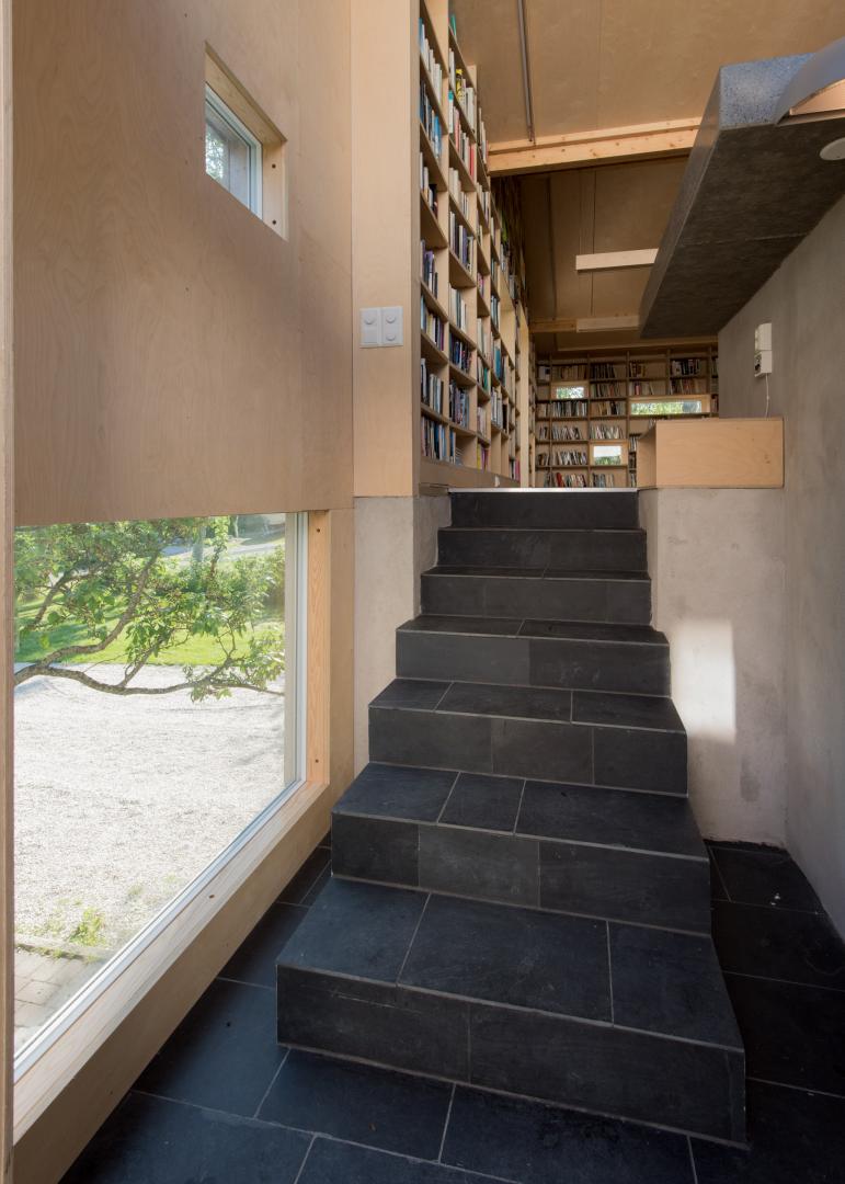 Utilizzando materiali naturali e non trattati come legno, pietra e cemento, gli Architetti Vincenzo Marchese e Petter Nordahl hanno creato una libreria combinata, completa di una cucina e di un'area di lavoro senza cambiare il sedime originale occupato dall'edificio, e lasciando quindi inalterato lo spazio occupato del territorio