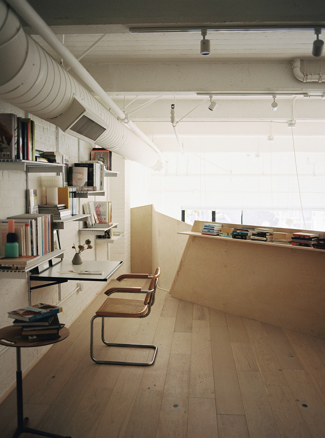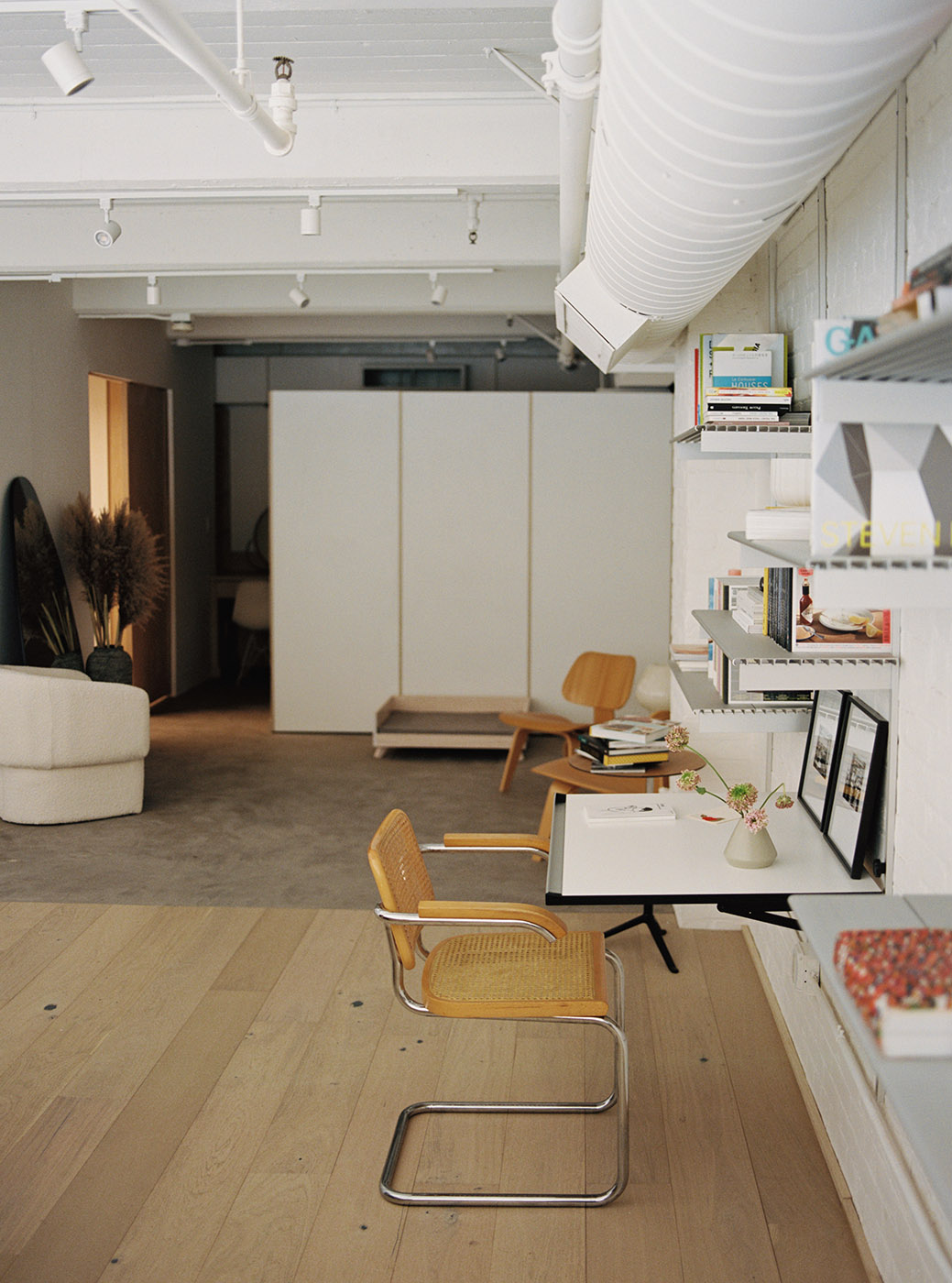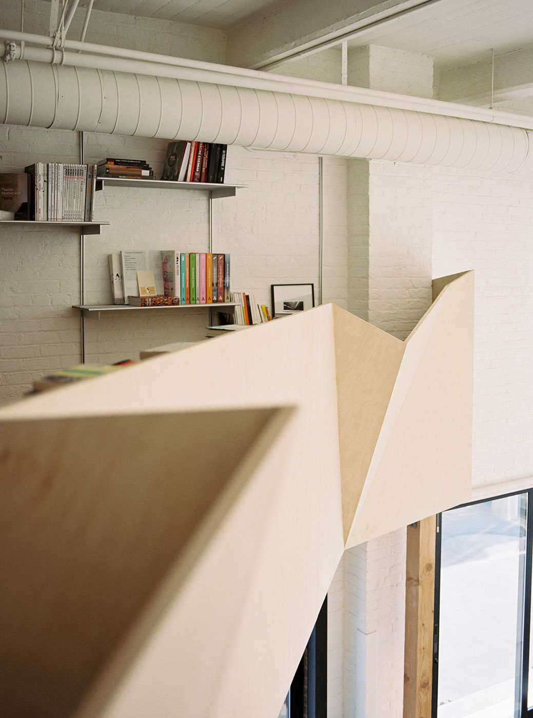 Lo spazio, nel momento in cui si entra nel loft, appare incorniciato dalle lampade a sospensione, e le luci guidano lo sguardo verso la gigantesca lastra di cemento in cima al balcone. Il soggiorno al piano terra fa da cornice alla grandiosa scala che sale al piano rialzato dell'appartamento. L'aspetto più caratterizzante del loft è il suo piano rialzato, che funge da studio o da sala lettura, sopra la cucina aperta e la zona giorno
