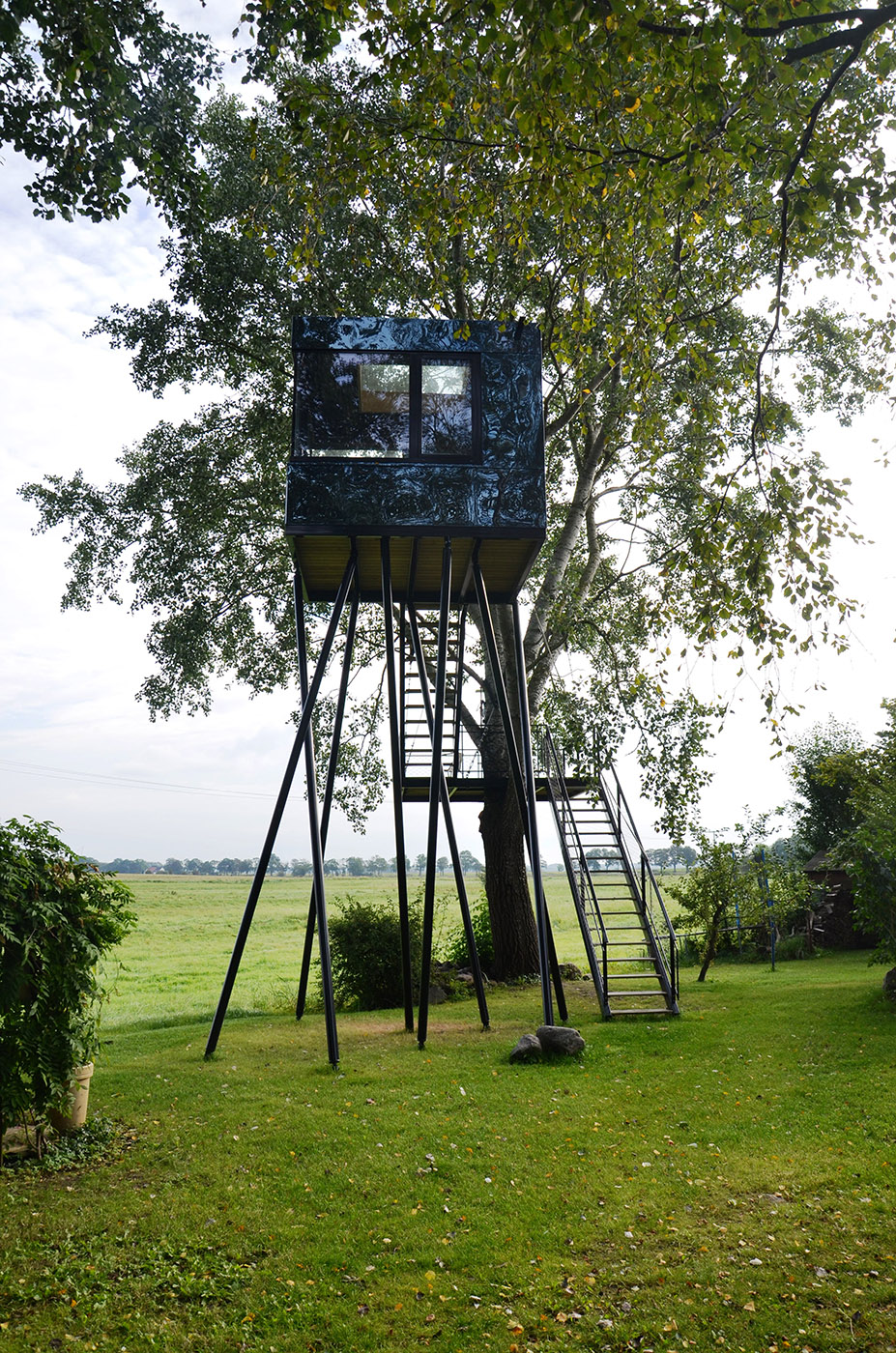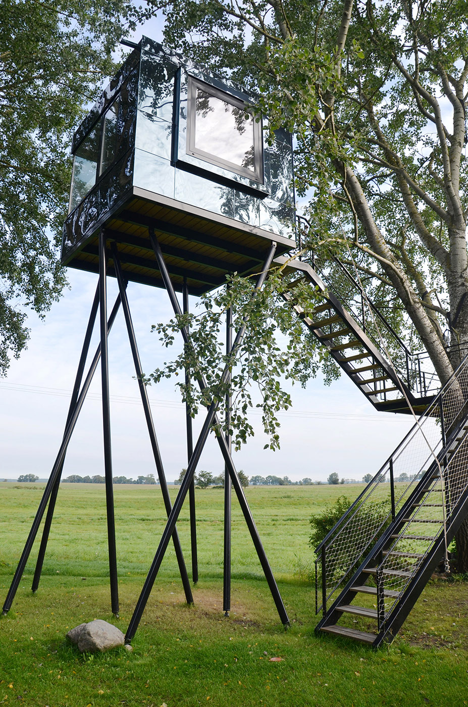 In un giardino privato sull'isola tedesca di Usedom, lo studio Baumraum progetta una casa sull'albero particolarmente attraente per i proprietari, dalla visuale libera sul paesaggio e dalla facciata in acciaio inossidabile annerito altamente riflettente