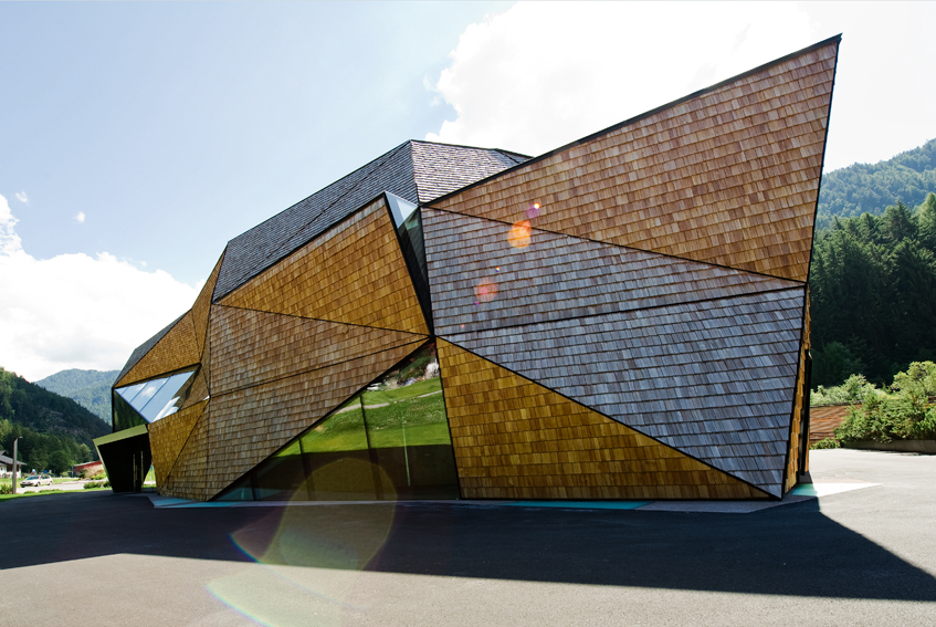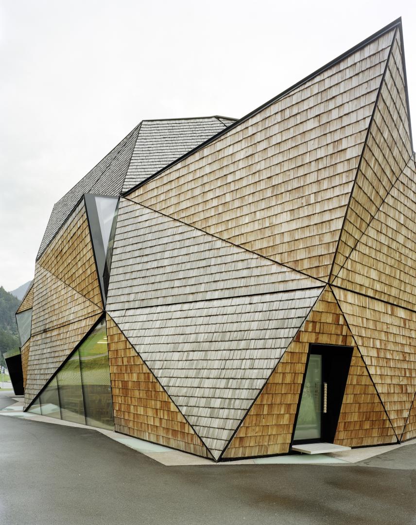 La facciata consiste in un sistema autoportante di triangolazioni. In questo sistema vengono ricavate delle aperture per favorire l`illuminazione. la facciata è rivestita di scandole in larice. Il rivestimento allude al blocco di legno grezzo non ancora rifinito