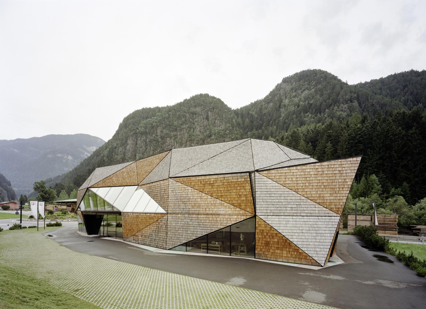 La costruzione in legno realizzata dallo studio di progettazione Bergmeisterwolf Architekten è in linea con l'antica tradizione di artigianato artistico del legno della Val Gardena, in Trentino Alto Adige