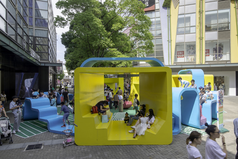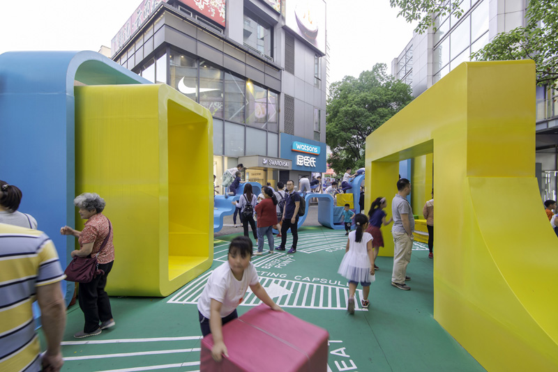 Delle scatole gialle a forma di capsule sono state inserite lungo il perimetro, piattaforme per gli adulti, spazi in cui poter riposare e fare delle pause, che sono in grado di garantire un certo grado di privacy, soprattutto per gli adulti. Grazie a questa installazione l'area commerciale è sempre molto affollata