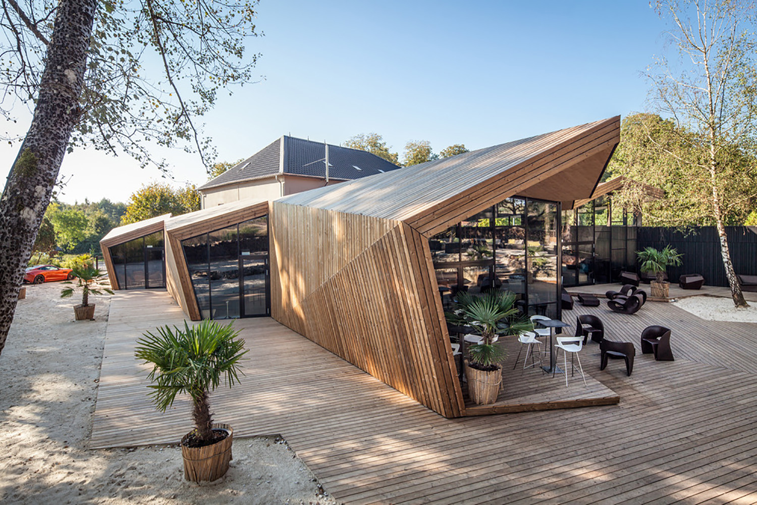 Il design dinamico consente di orientare la barra e le aree di ristorazione verso l'esterno, guidando le viste verso gli alti fusti degli alberi. Appoggiandosi alla casa esistente e grazie alla sua forma triangolare, il tetto rigido autoportante richiede pochi punti strutturali