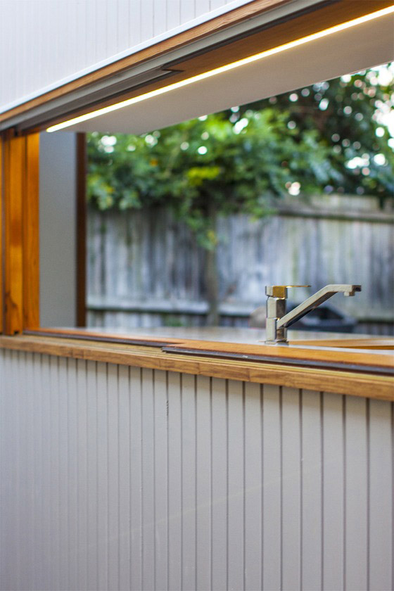 Una fascia allargata della gronda funge da riflettore che a sua volta si serve della parete vicina per illuminare cucina, soggiorno e sala da pranzo, attraverso le finestre poste all'interno di un muro di falegnameria