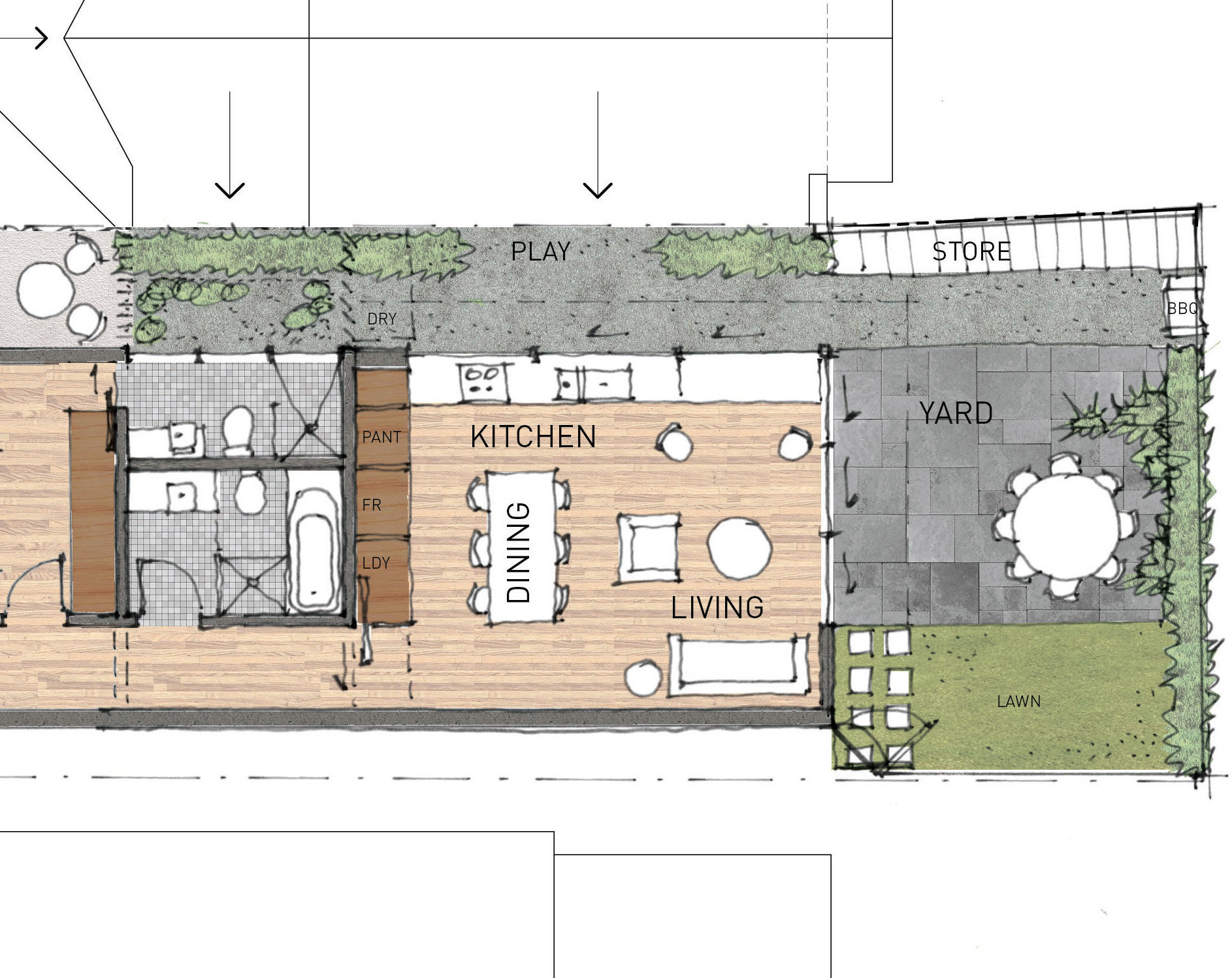 Il passaggio laterale largo 1,5 metri e collegato sia agli spazi abitativi che al cortile, in modo tale che si potesse aumentare il senso di spazio nel piccolo sito. Inoltre sono state ristrutturate delle parti frontali dell'abitazioni che comprendevano delle zone umide e una camera da letto