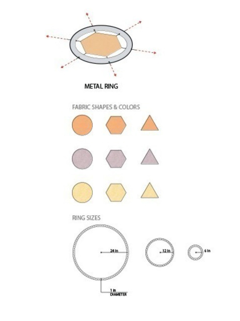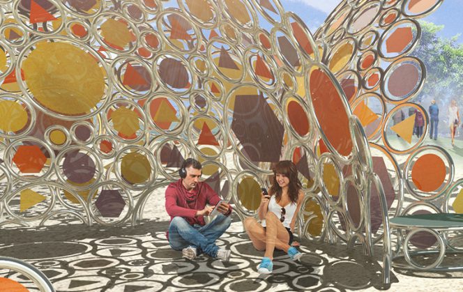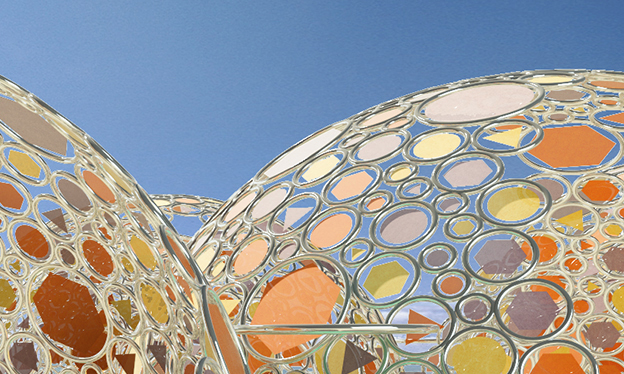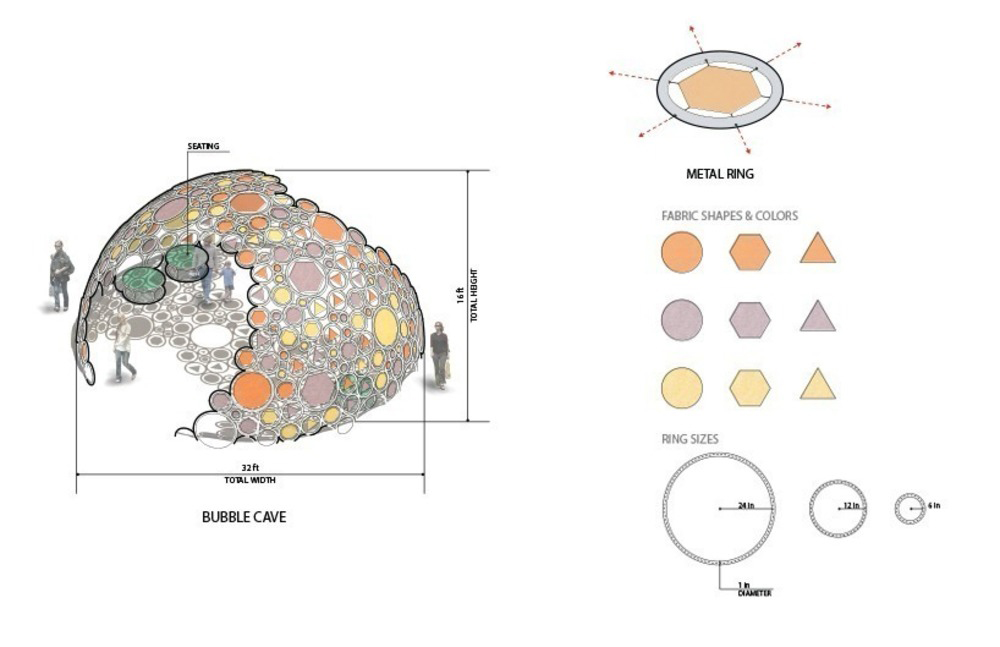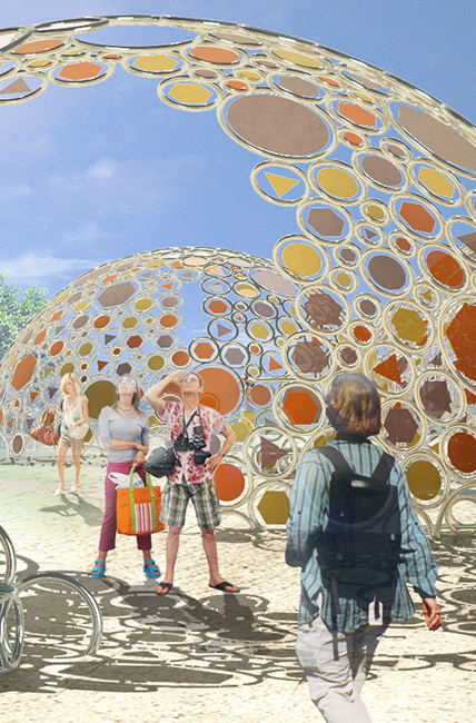 Il design è particolarmente adatto ai climi caldi durante tutto l'anno come installazione permanente. Sfruttando le proprietà di trazione del metallo e del tessuto, le cialde sono realizzate in tre dimensioni di anelli metallici saldati che creano uno scheletro per il tessuto. Il tessuto viene quindi agganciato a occhielli metallici come mostrato nei disegni del negozio. La super struttura tensile sarà saldata (Mig) insieme nel sito o nei quadranti sferici nel negozio e consegnata per l'assemblaggio finale. (La plastica colorata può essere sostituita al tessuto). Il design utilizza molteplici forme geometriche e colori che consentono di vedere la città o il paesaggio attraverso un filtro caleidoscopico