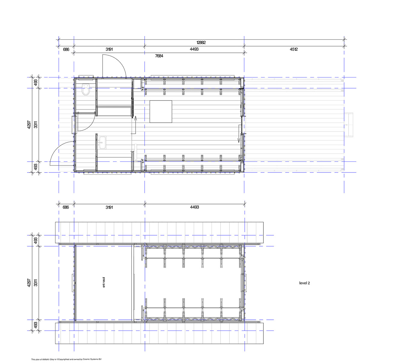 ANNA Stay ha due gusci scorrevoli e una parte fissa; quest’ultima ospita la cucina, la doccia, il wc e una dispensa. Sopra la cucina si trova un soppalco, abbastanza grande per un secondo letto king size, consentendo di avere 4 posti letto in totale. ANNA meet è invece concepita come una piattaforma vuota e multifunzionale, per ospitare una vasta gamma di attività (yoga, scrittura, riunioni...), ANNA Me è infine una versione completamente personalizzabile di ANNA