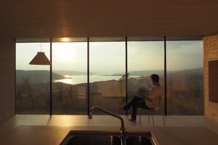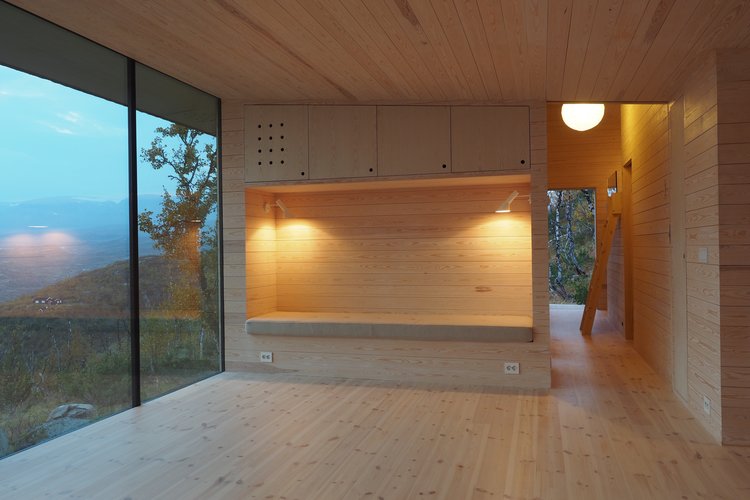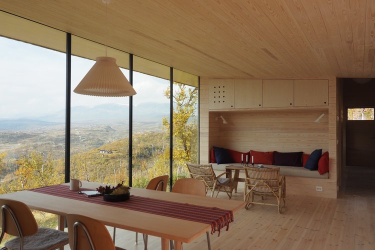 L'edificio è rivestito in legno di pino, dentro e fuori. 3 strati di materiale isolante e pannelli di vetro offrono protezione solare. La vista è completamente naturale, quella del Lago Ustevann, le montagne di Hallingskarvet e del ghiacciaio Hardangerjøkulen, tutti questi elementi paesaggistici nel medesimo panorama