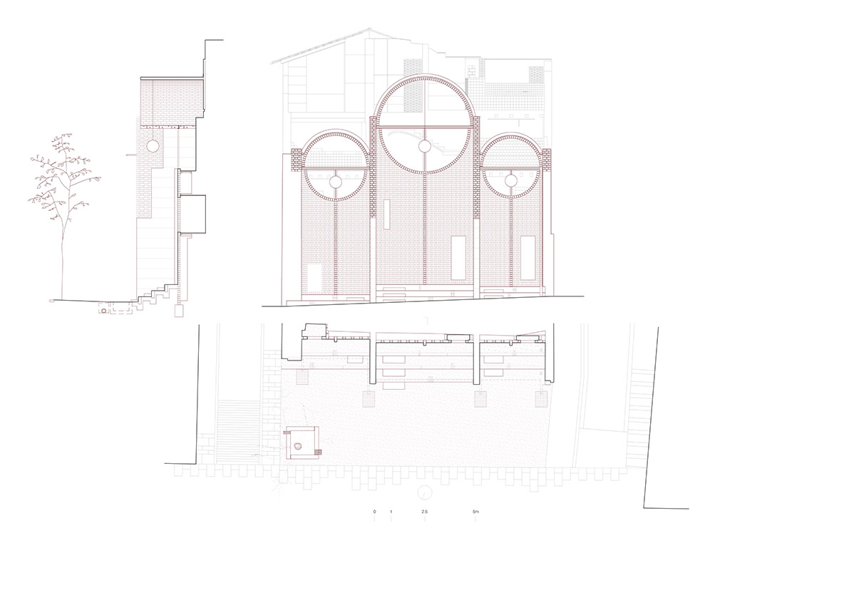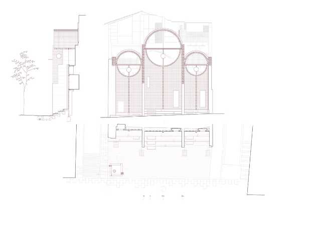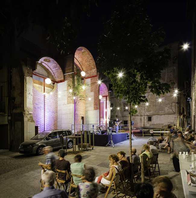 Enfatizzando il mattone cavo, è stato creato uno “scenario” strutturale di emergenza, che completa ciò che i contrafforti suggeriscono, rivelando sullo sfondo le tracce di attività domestica segnate sulla parete. Una costruzione di tre volte e quattro nicchie si rivolge allo spazio pubblico come una facciata porosa. È volutamente una struttura incompiuta. L'artista visivo Quim Domene interviene a posteriori nelle nicchie, con elementi allegorici che si rifanno alla storia del quartiere